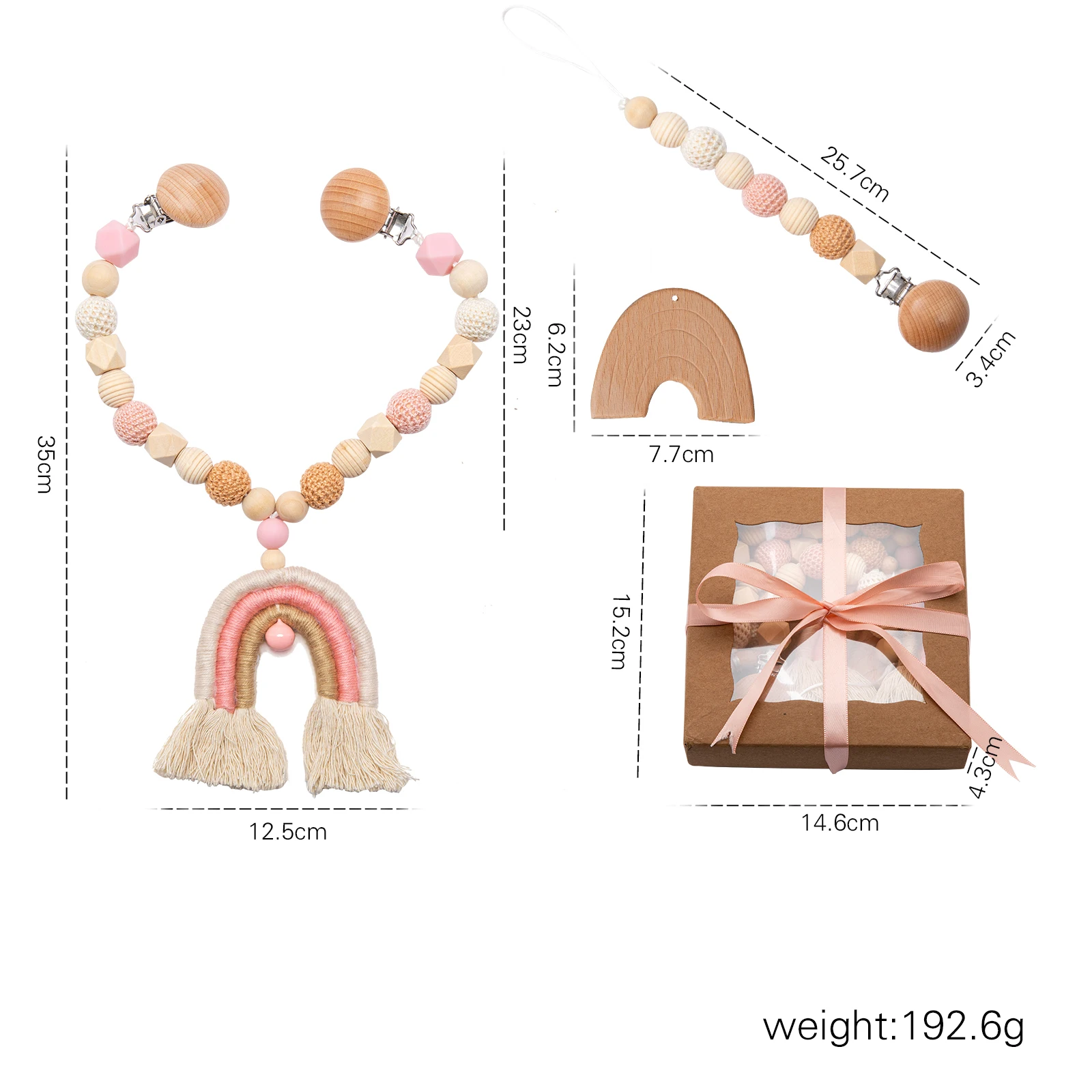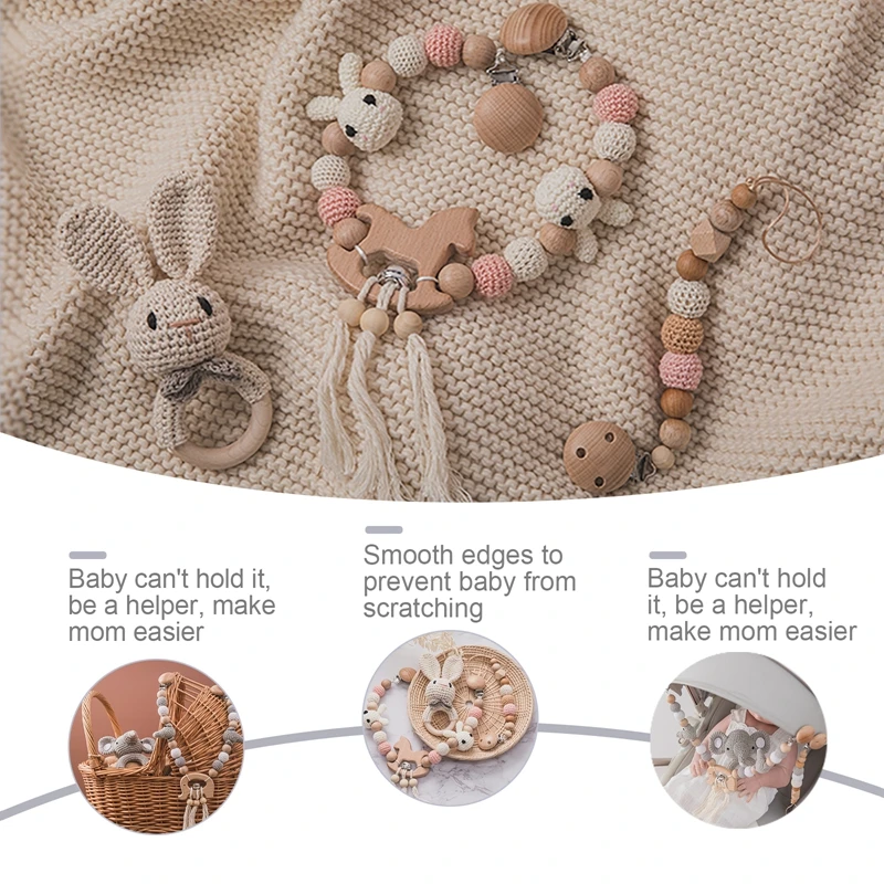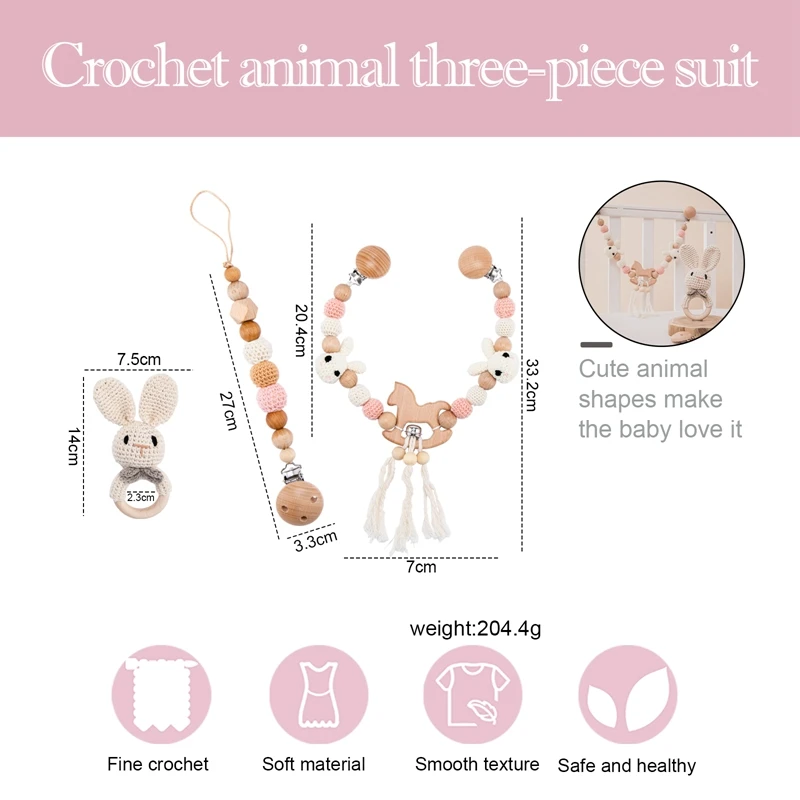 Detta set av träleksaker för bebis kombinerar hantverksskicklighet med lekfull design. Leksakerna är tillverkade i trä med crochet-garn och kommer i en neutral färgpalett som passar i de flesta barnrum.
