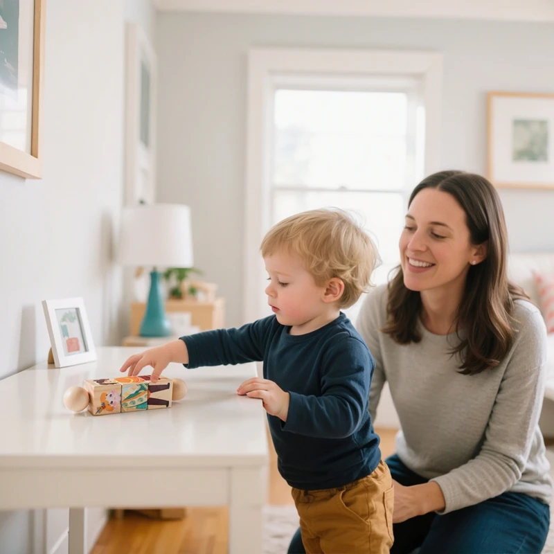 Träleksak som utvecklar hand-ögon-koordination genom roterande blockpussel.