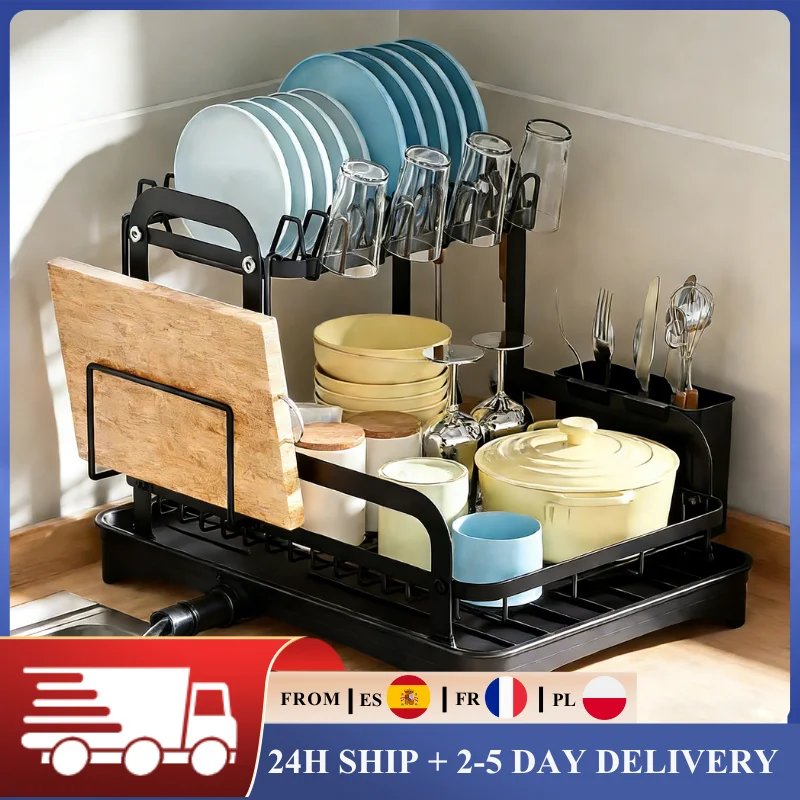 Det här tvåvånings diskstället är utformat för att göra disk och torkning enklare och bättre organiserad på köksbänken. Den robusta konstruktionen fångar upp vatten samtidigt som den håller bestick och koppar välorganiserade.