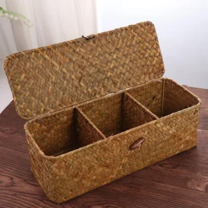 Denna förvaringskorg är handvävd i växtfiber och har tre separata fack i en rektangulär låda med lock. Perfekt för kläder, accessoarer eller kontorsmaterial och hjälper dig hålla ordning i garderob, byrå eller skrivbord.