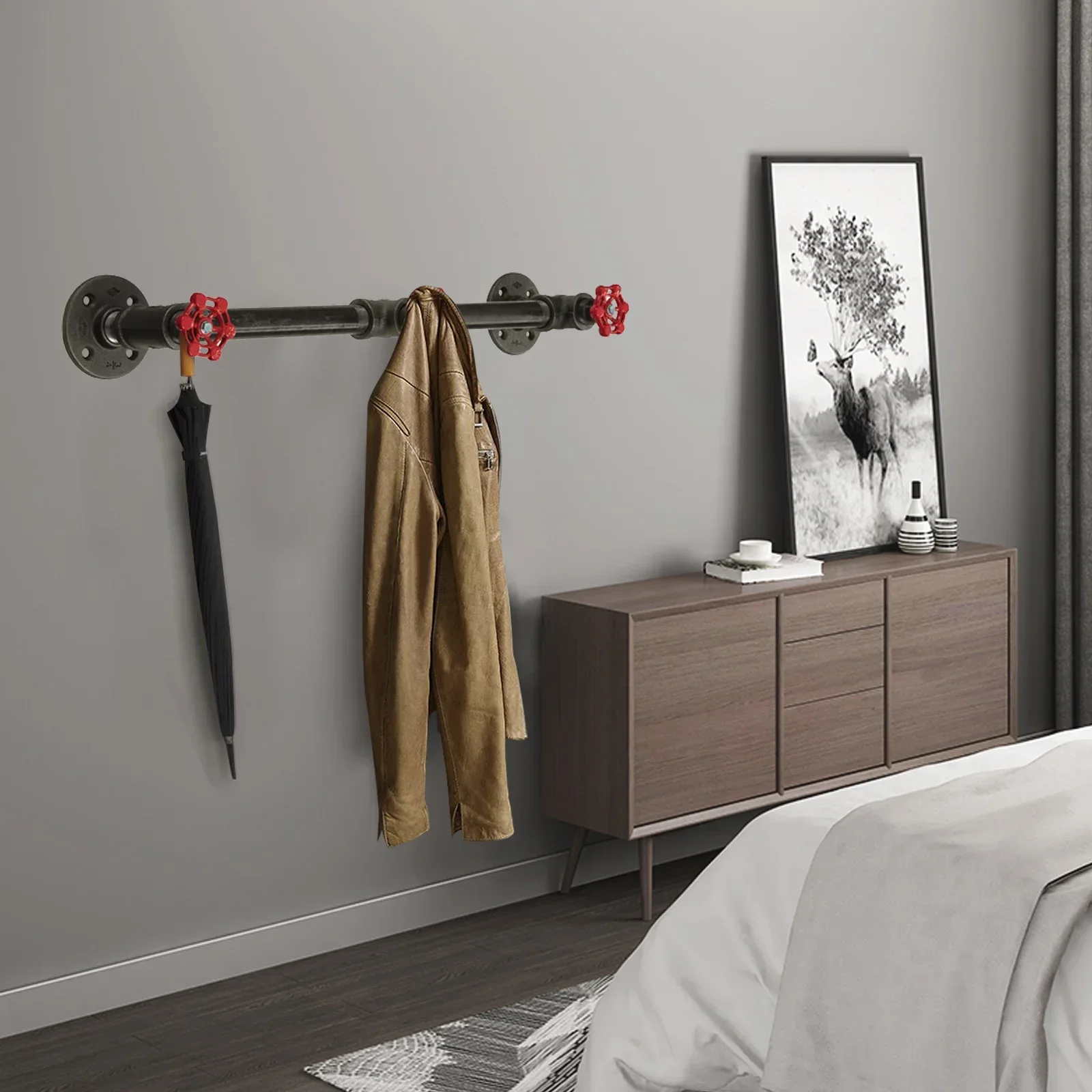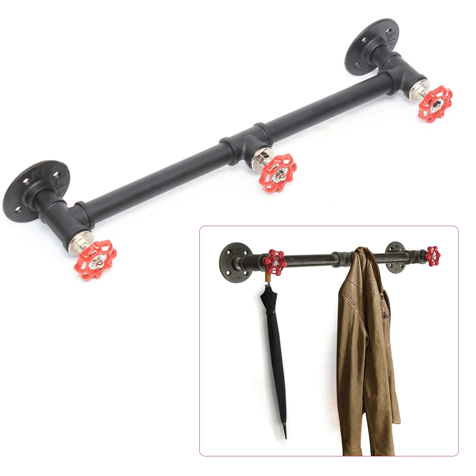 Montering: Väggmonterad med förborrade hål för enkel installation. Innehåll: 1x industriell hatthängare, 3x röda ventilswitchar som fungerar som krokar, samt övriga installationsdelar.