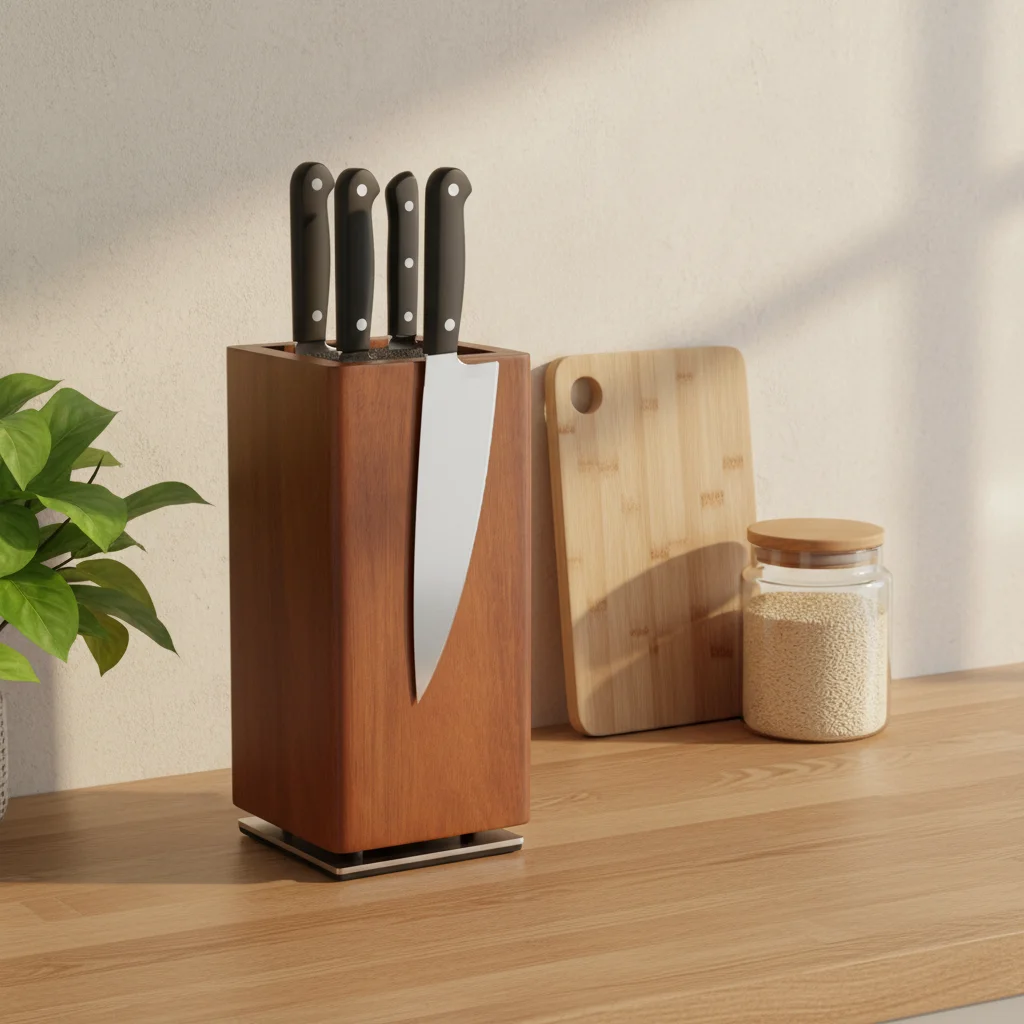 En stilren magnetisk knivhållare i akacia-trä med 360° roterande funktion som gör knivar och köksredskap lättillgängliga när du behöver dem.