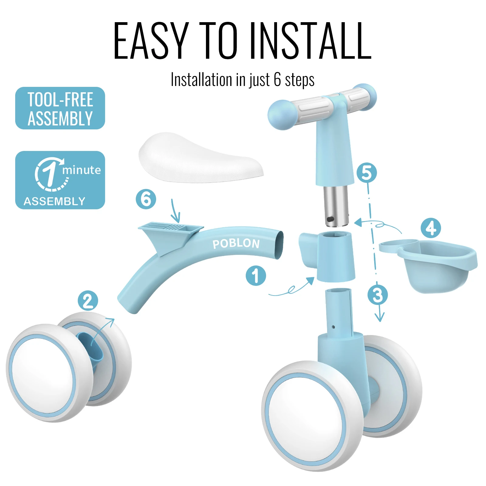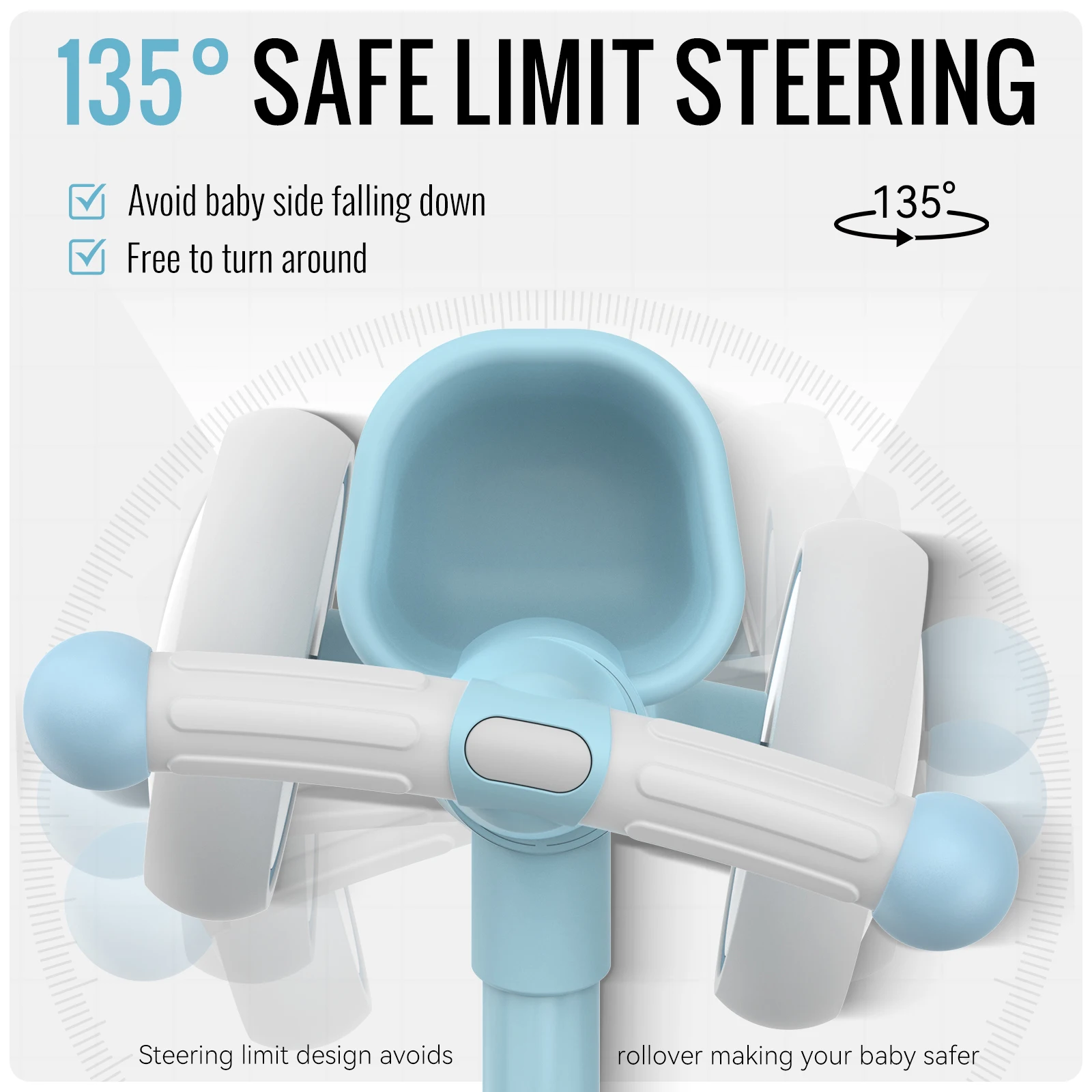 Designen är minimalistisk och barnvänlig med mjuka kurvor och en enkel styrning för enkel hantering.