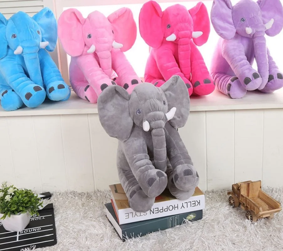 Mjukt elefantgosedjur i plysch som fungerar som kudde, sällskap och viloplats för lek och vila.