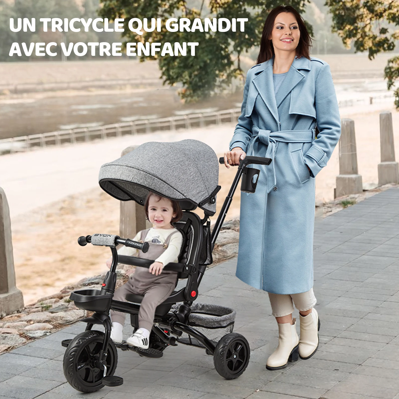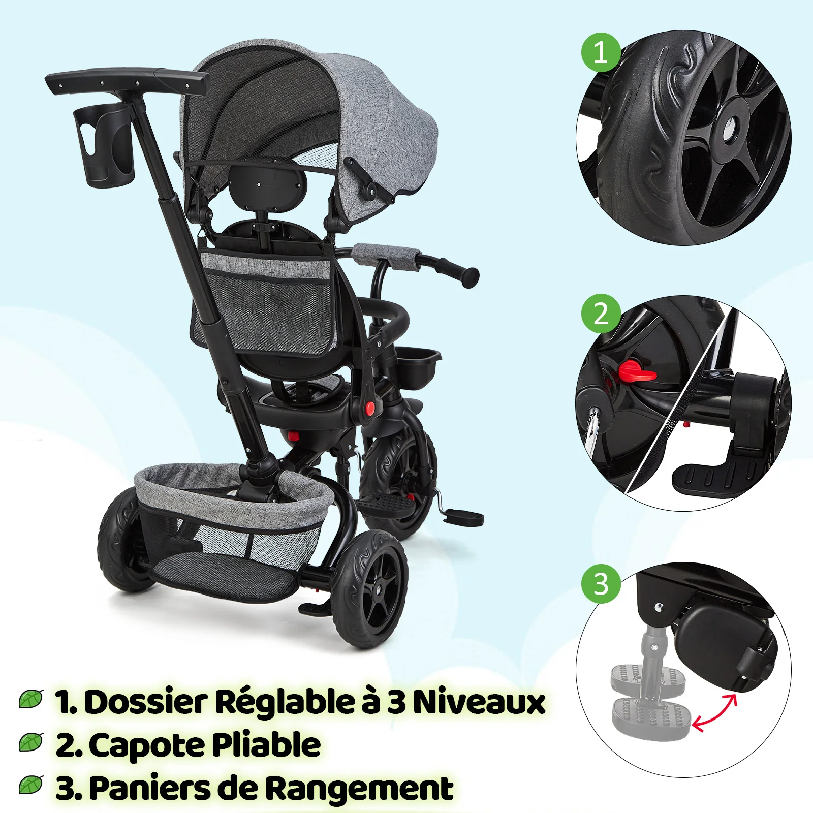 Mångsidig 6-i-1 trehjuling som växer med barnet: hopfällbar, vändbar sits, solskydd och 360°-sitsrotation.