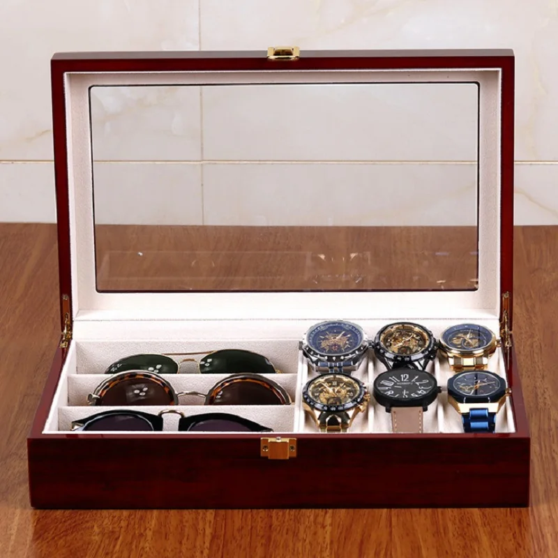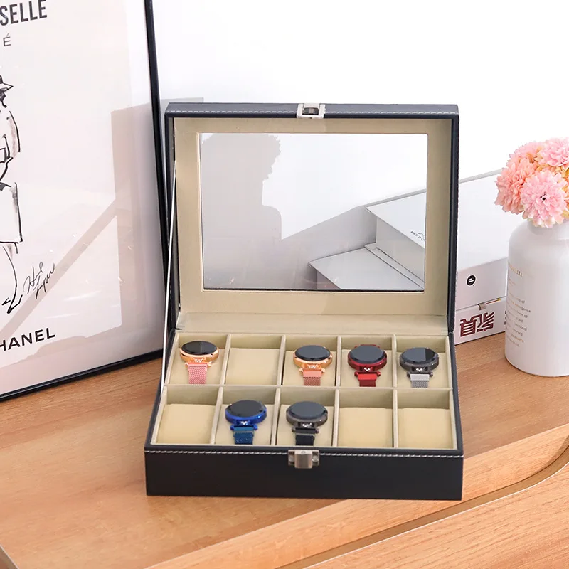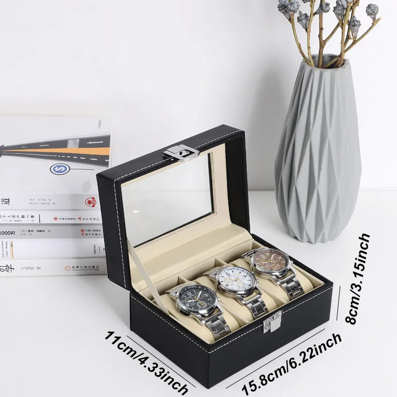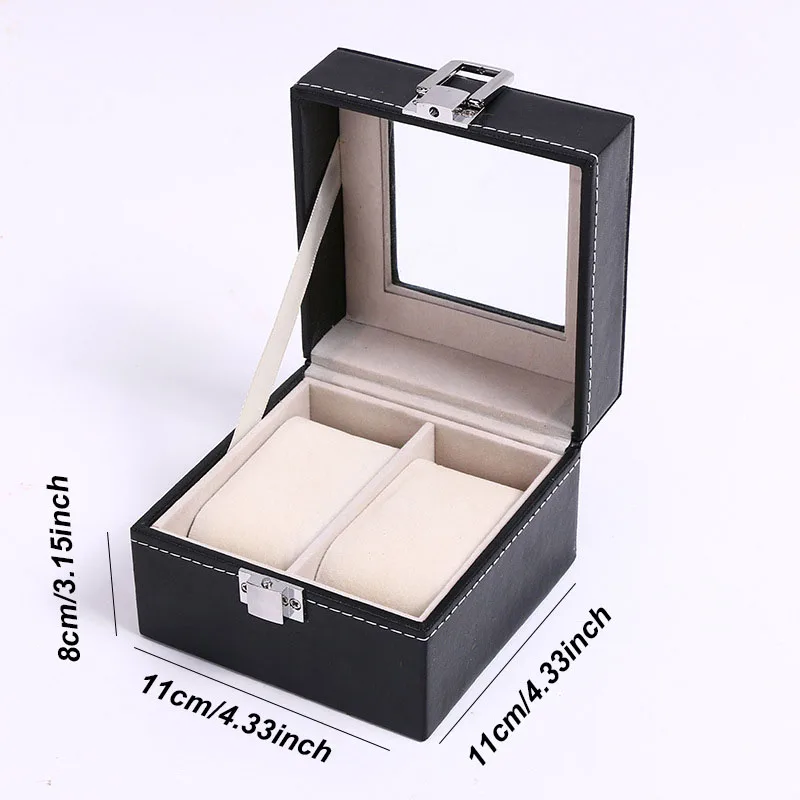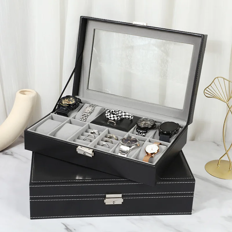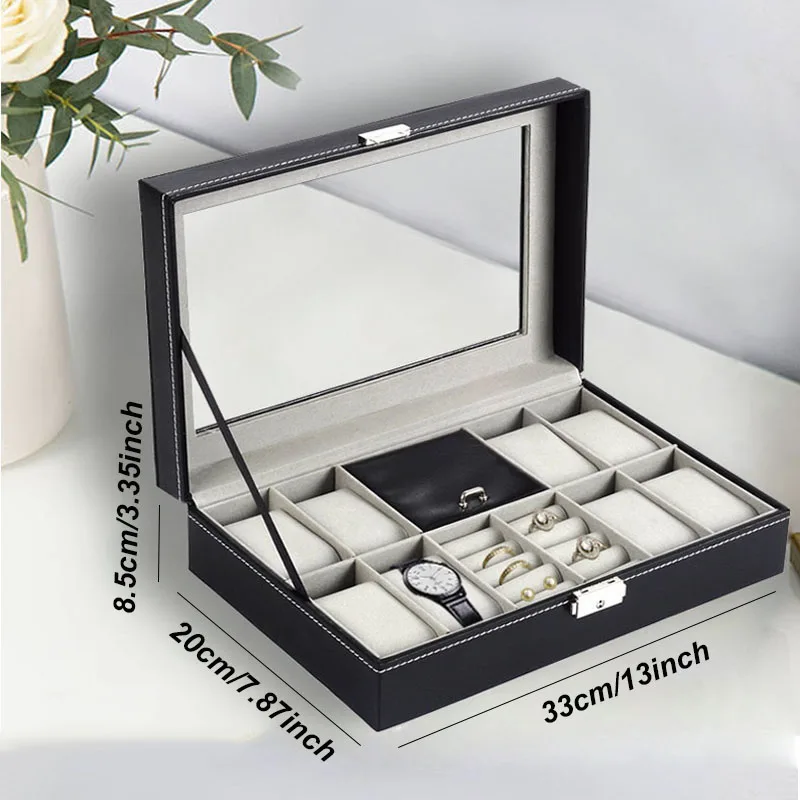 Elegant förvaringslåda i PU-läder med genomskinligt fönster för klockor, smycken och solglasögon.