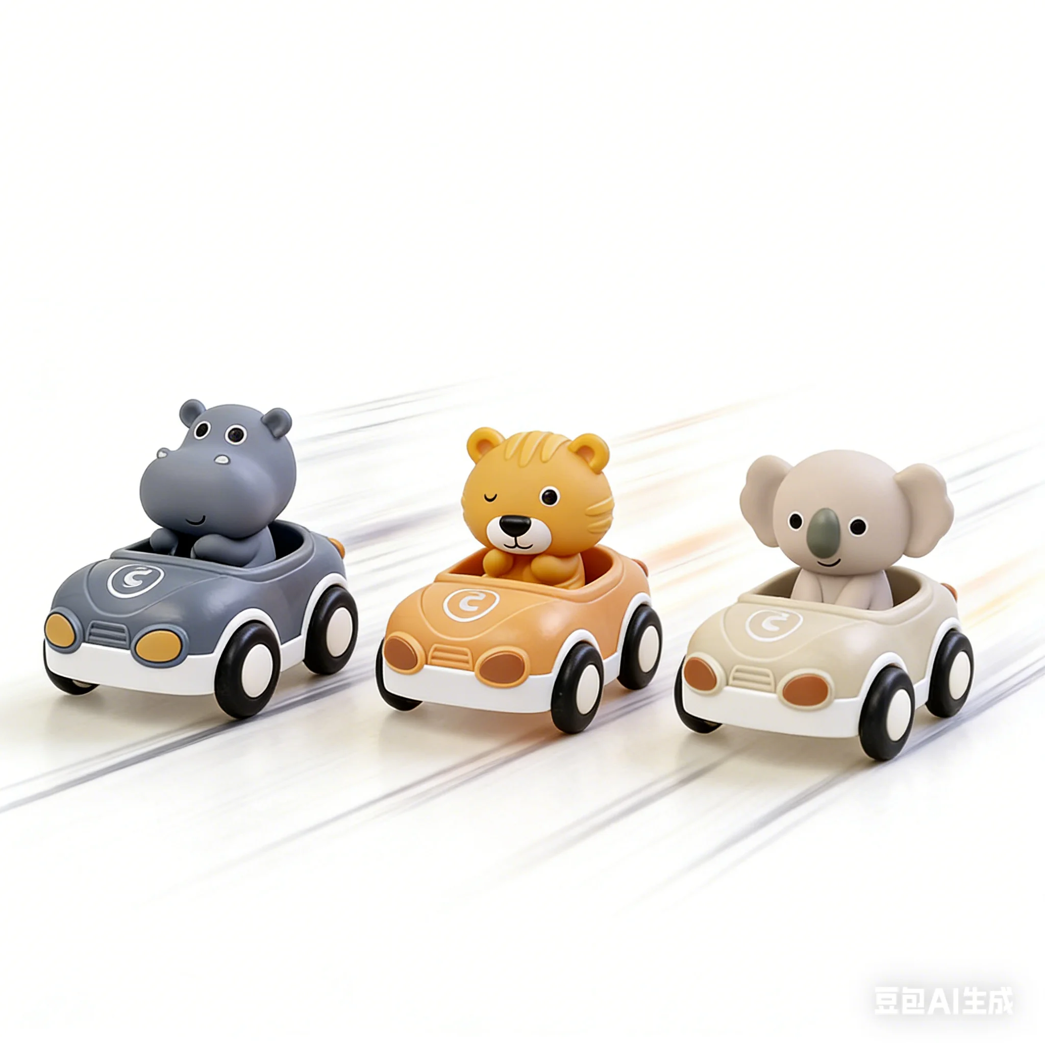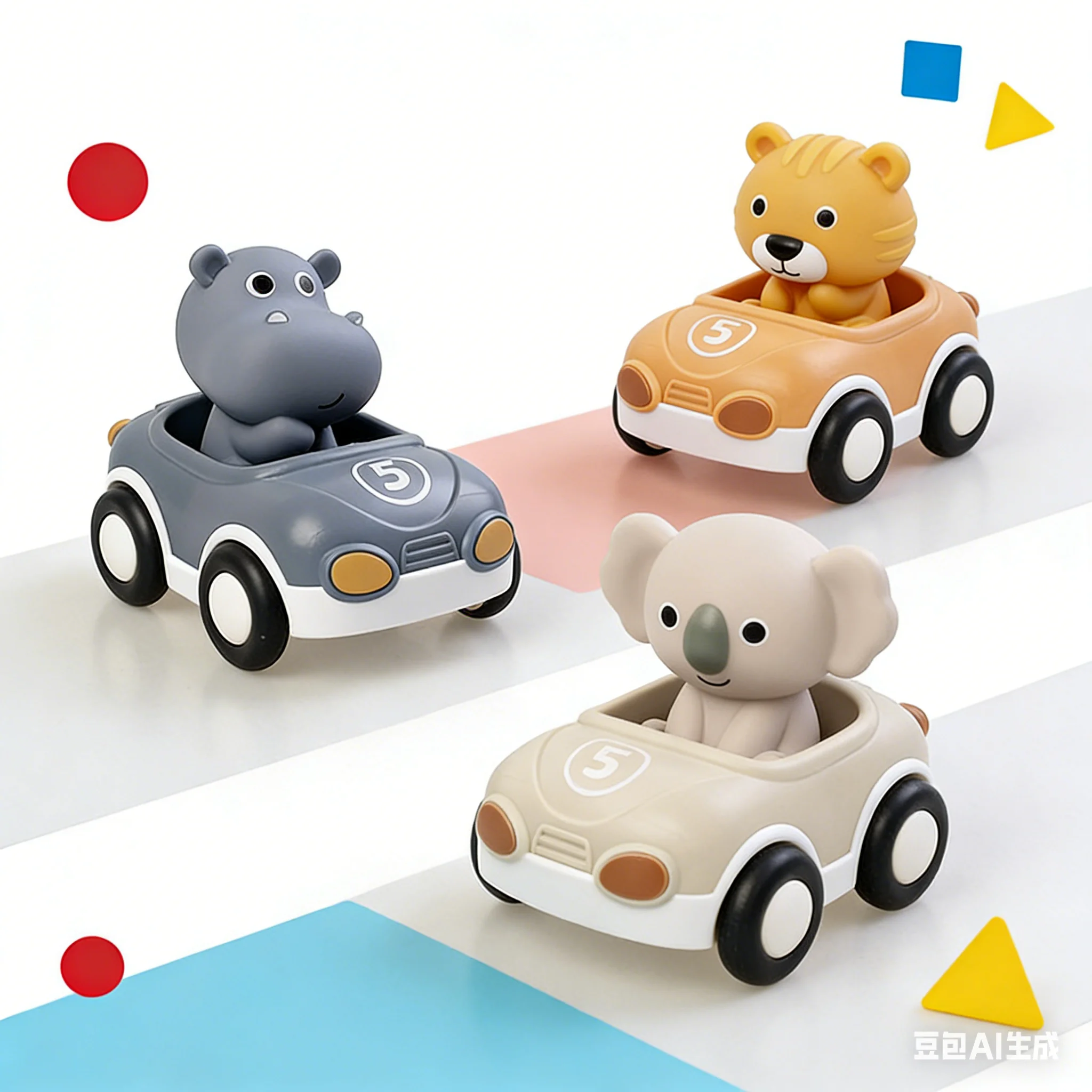 En lekfull leksaksbil för små barn med avtagbart mjukt fingeromslag och djurinspirerade förare för motorikträning.