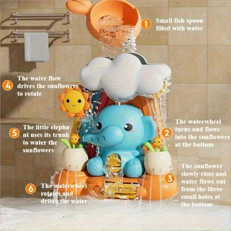 Denna vattenleksak är designad för badstunden och lek i duschen. Tillverkad i robust ABS-plast och utrustad med sugkoppar som gör det möjligt att fästa leksaken vid badkaret, en snurrande del och ett vattenhjul i form av en baby-elefant. Leken uppmuntrar nyfikenhet och finmotorik i en trygg, barnanpassad miljö.