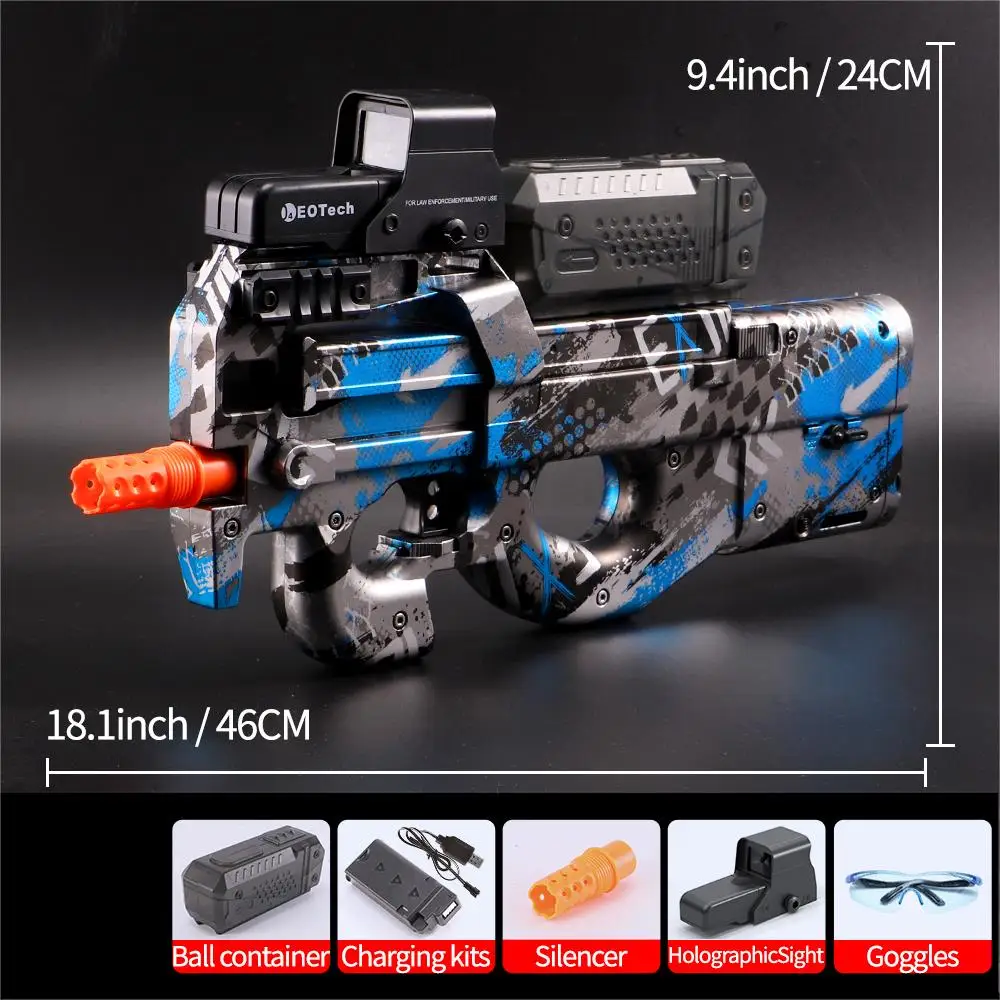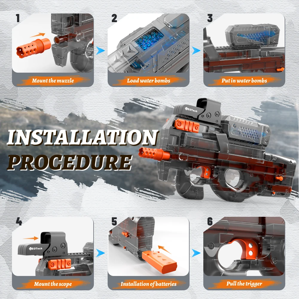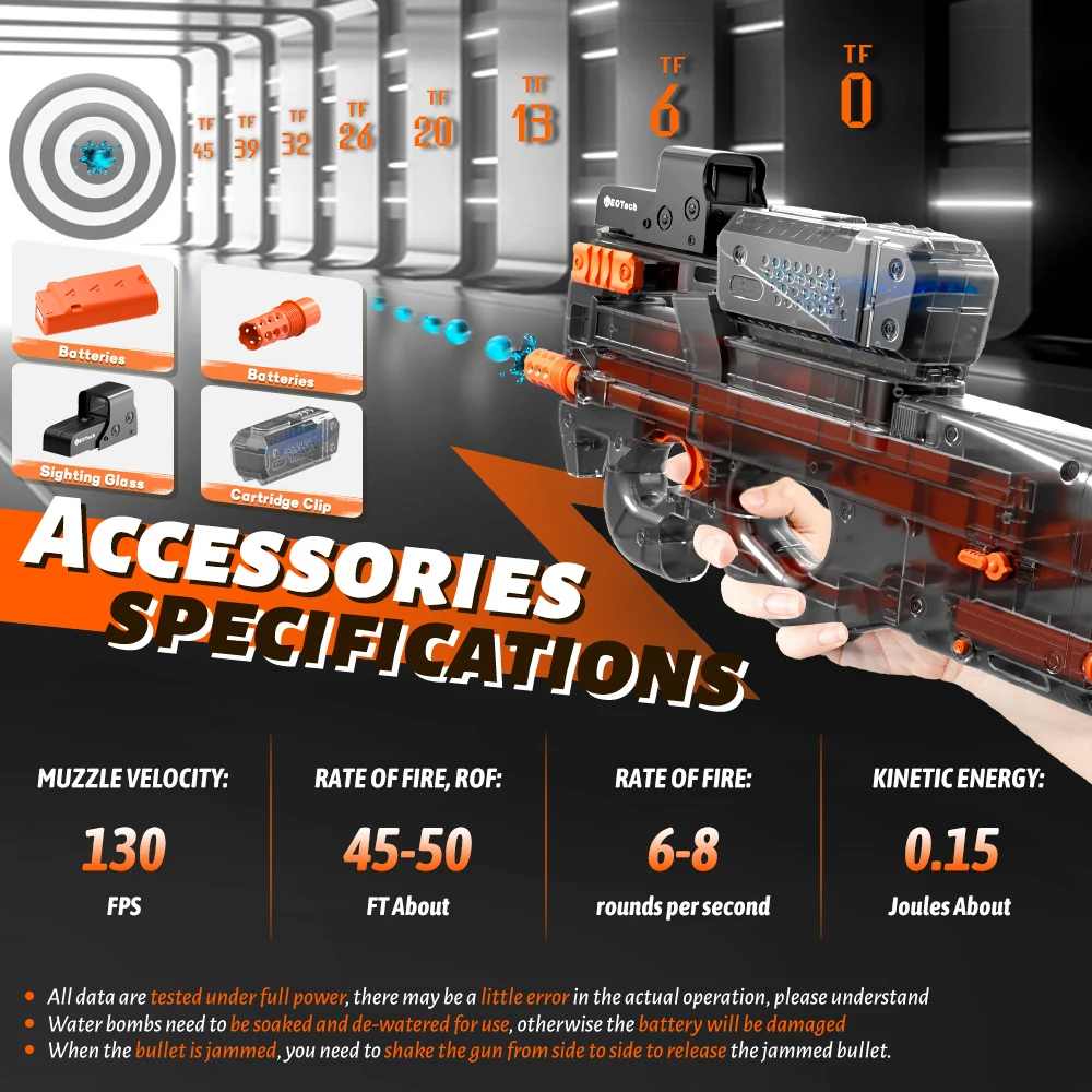 En futuristisk, pistolliknande Splatter Ball-leksak i genomskinlig plast med orange och svarta detaljer. Den är helt automatiskt och elektriskt driven, avsedd för utomhusspel med gelkulor utan riktiga kulor.