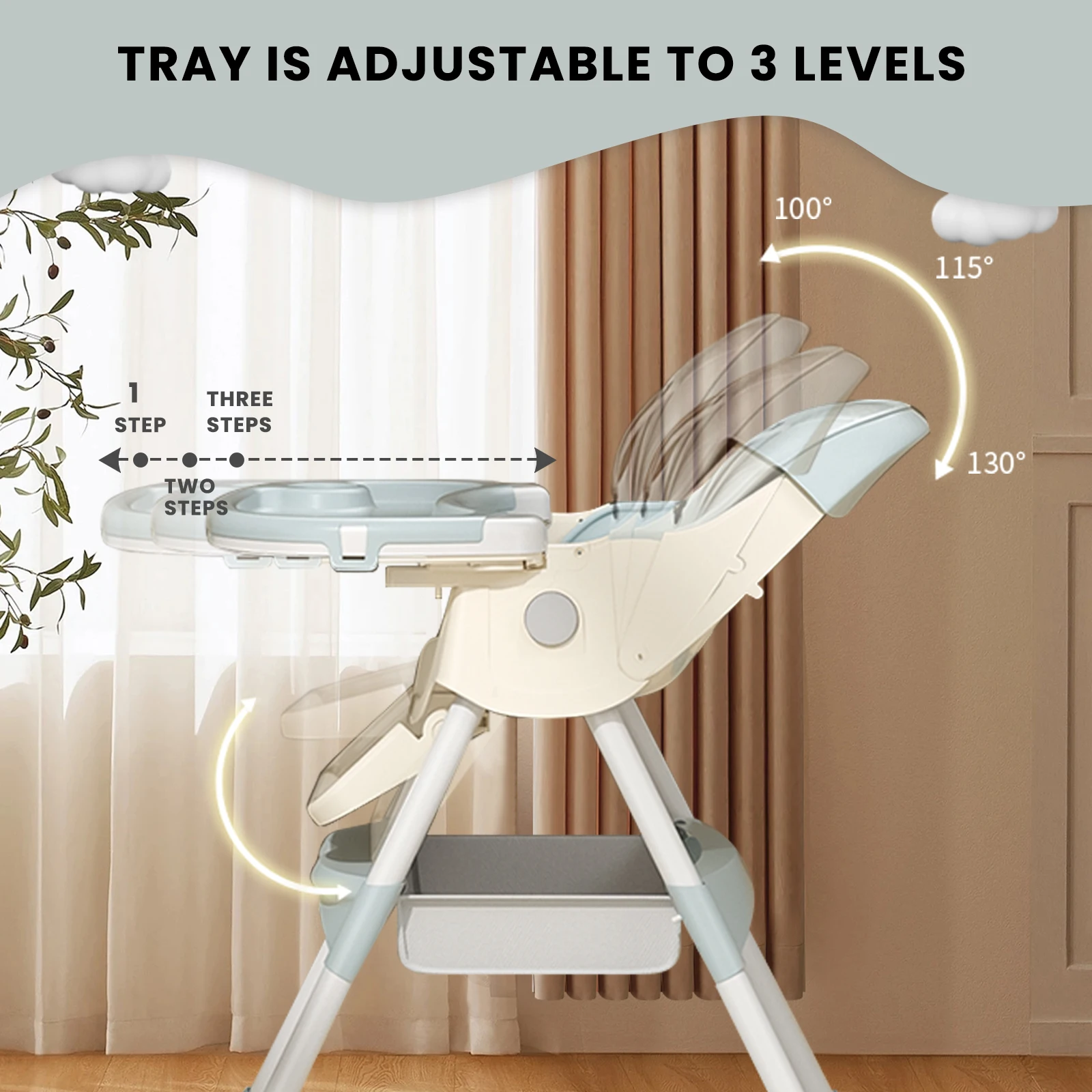 Fällbar två-i-ett barnstol med avtagbar bricka och leksakshållare.