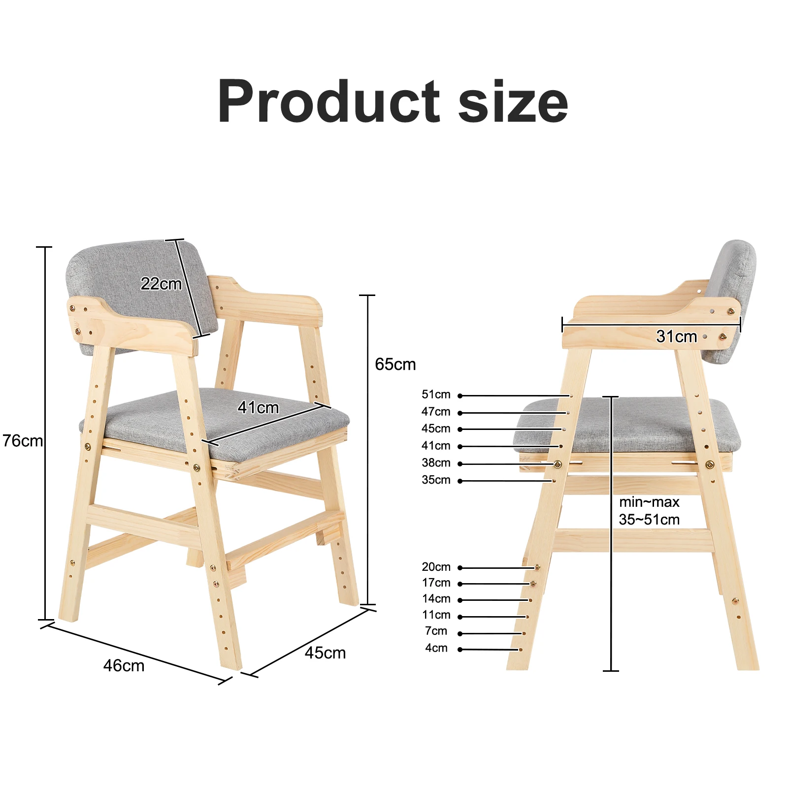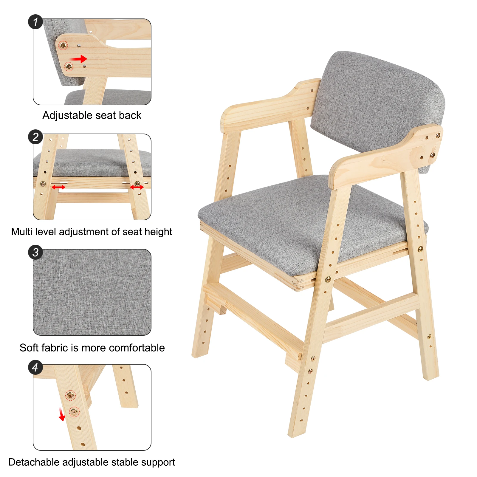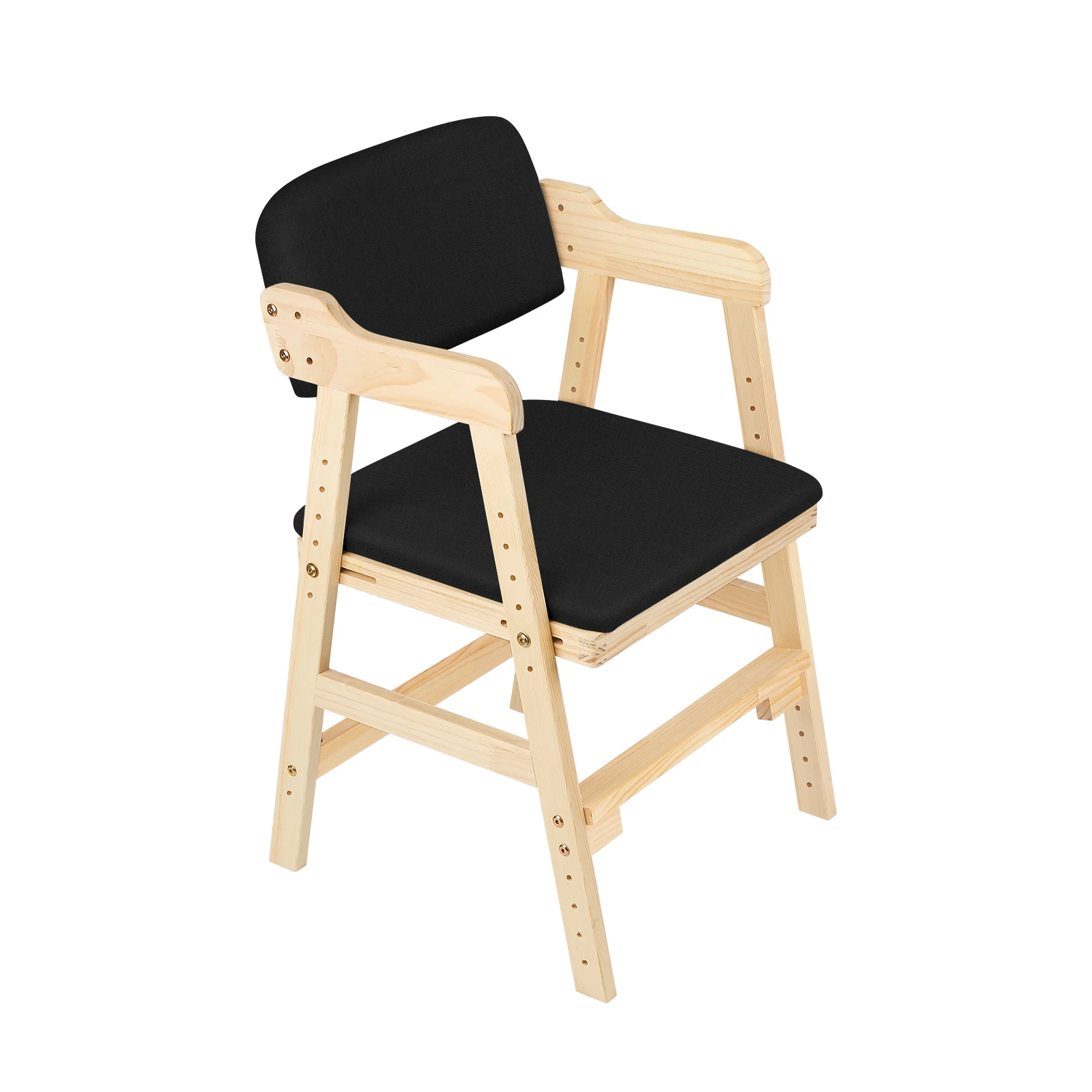 Höjdjusterbar barnstol i trä (furu) för 3–15 år, för måltider och lärande, vuxenstol, färger: beige, svart, rosa, grå
