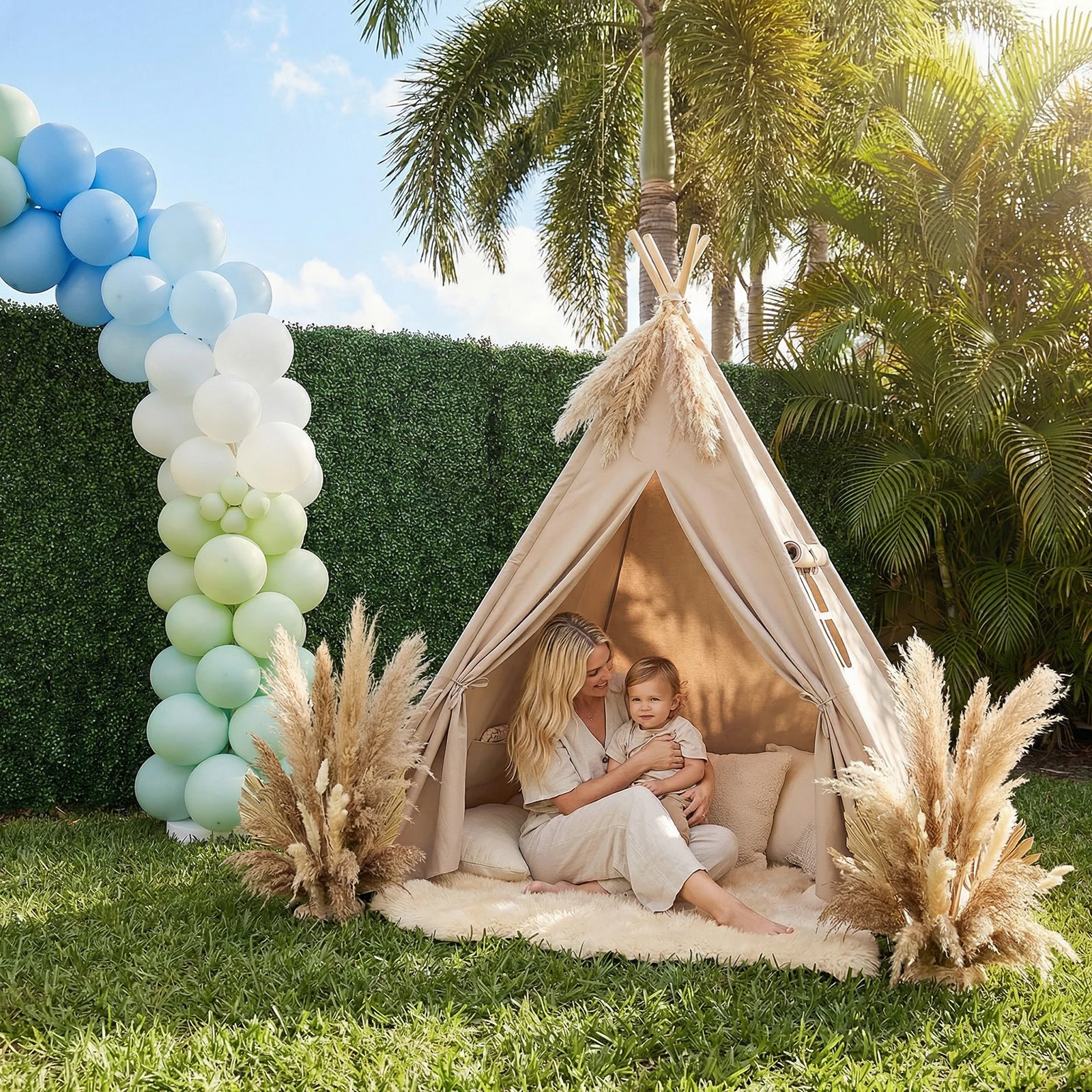 Lättviktigt teepee-tält i naturfärg för lek, vila och fantasi – inomhus eller utomhus.