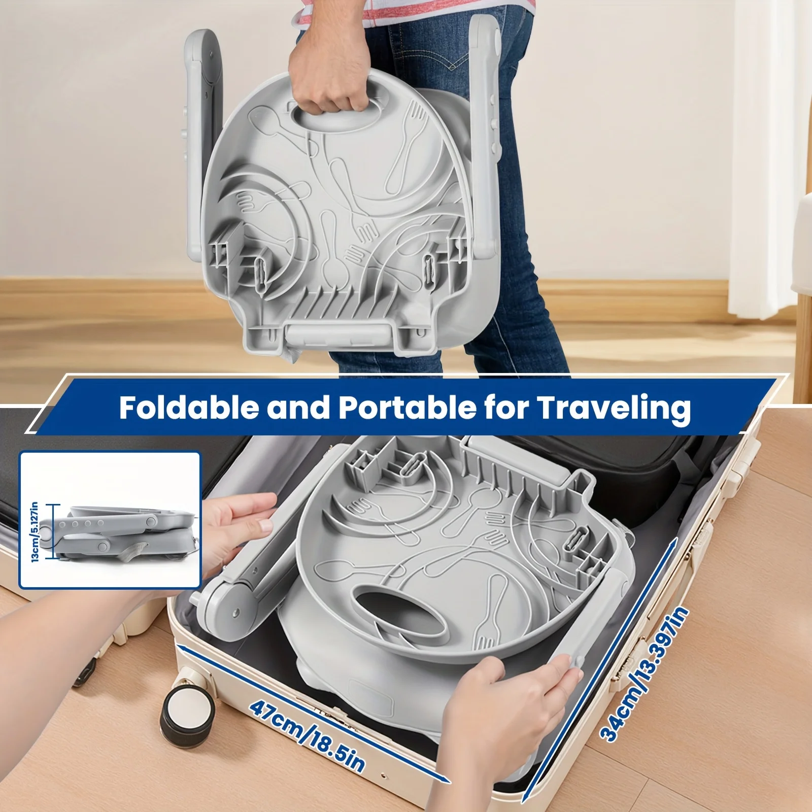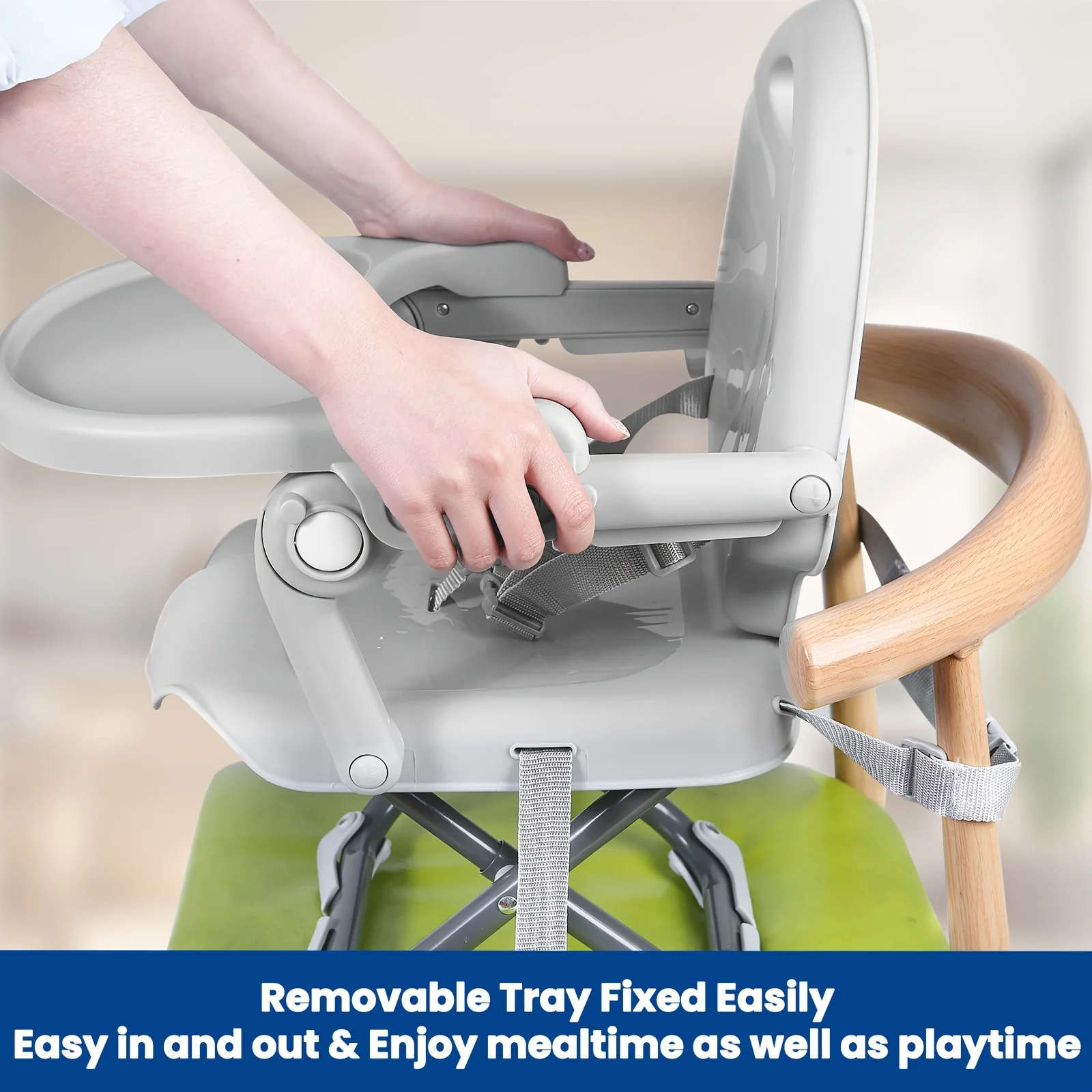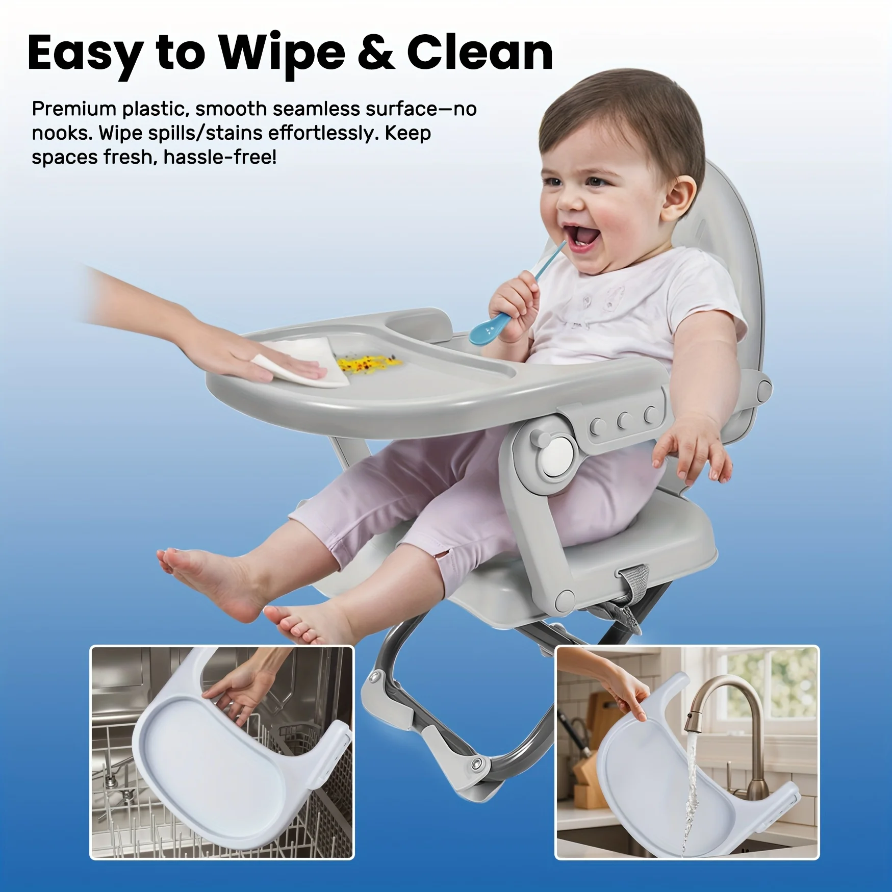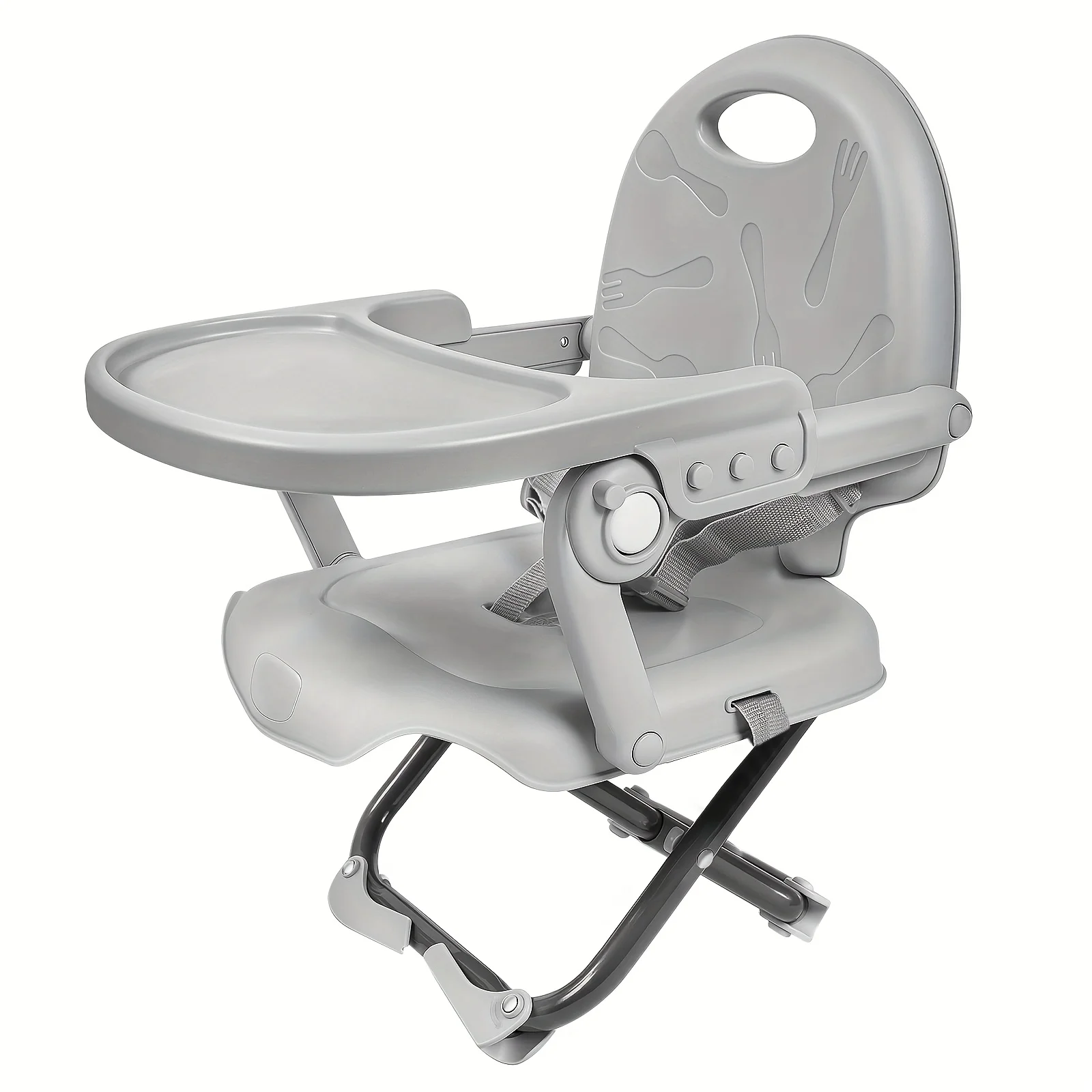 Justerbar och portabel barnstol med säkerhetsfunktioner och avtagbar bricka.