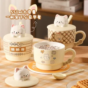 Kattmotivet och den rundade formen ger den här frukostkoppen en lekfull känsla som passar lika bra vid frukostbordet som i studentrummet. Det höga, rymliga formatet gör den praktisk för gröt, yoghurt, soppa eller andra snabba vardagsmål.
