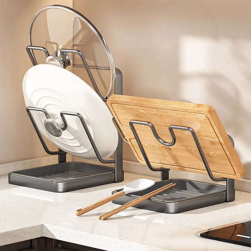 Mångsidig bänksförvaring för kastrullock, spatlar och skärbräda