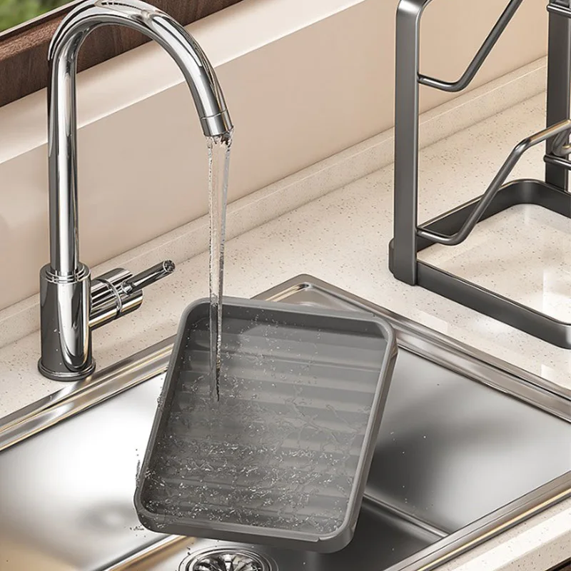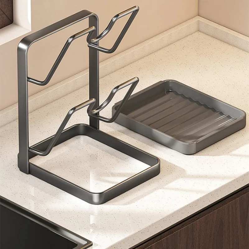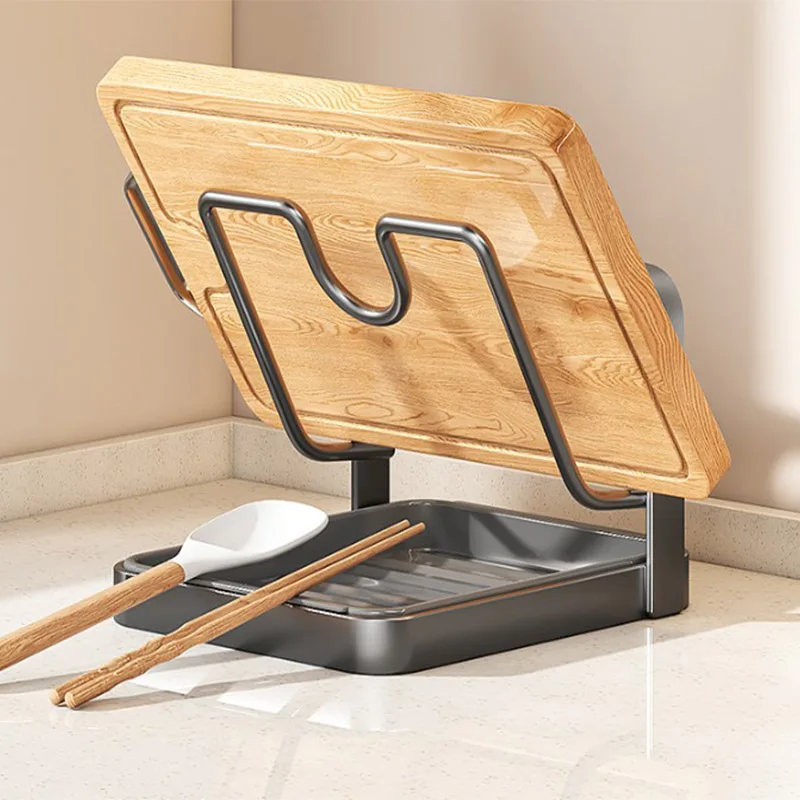 Köksförvaringsställ för kastrullock, spatlar och skärbräda med avrinning