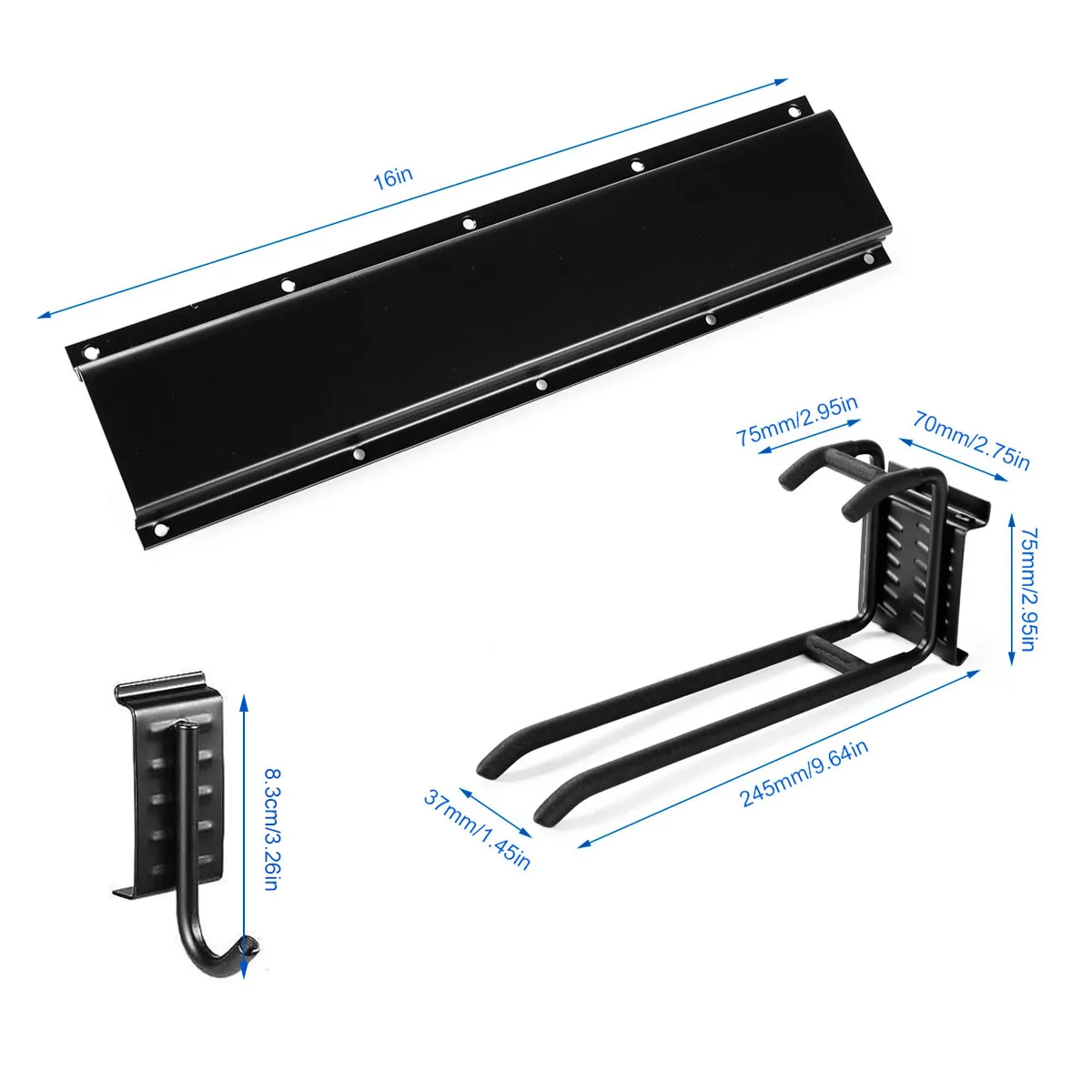 Kraftig väggmonterad verktygsförvaring i kolstål med gummibelagda krokar för effektiv organisering i garaget eller hemmet.