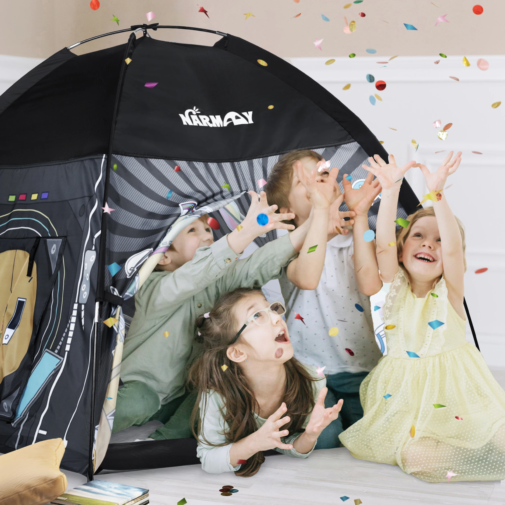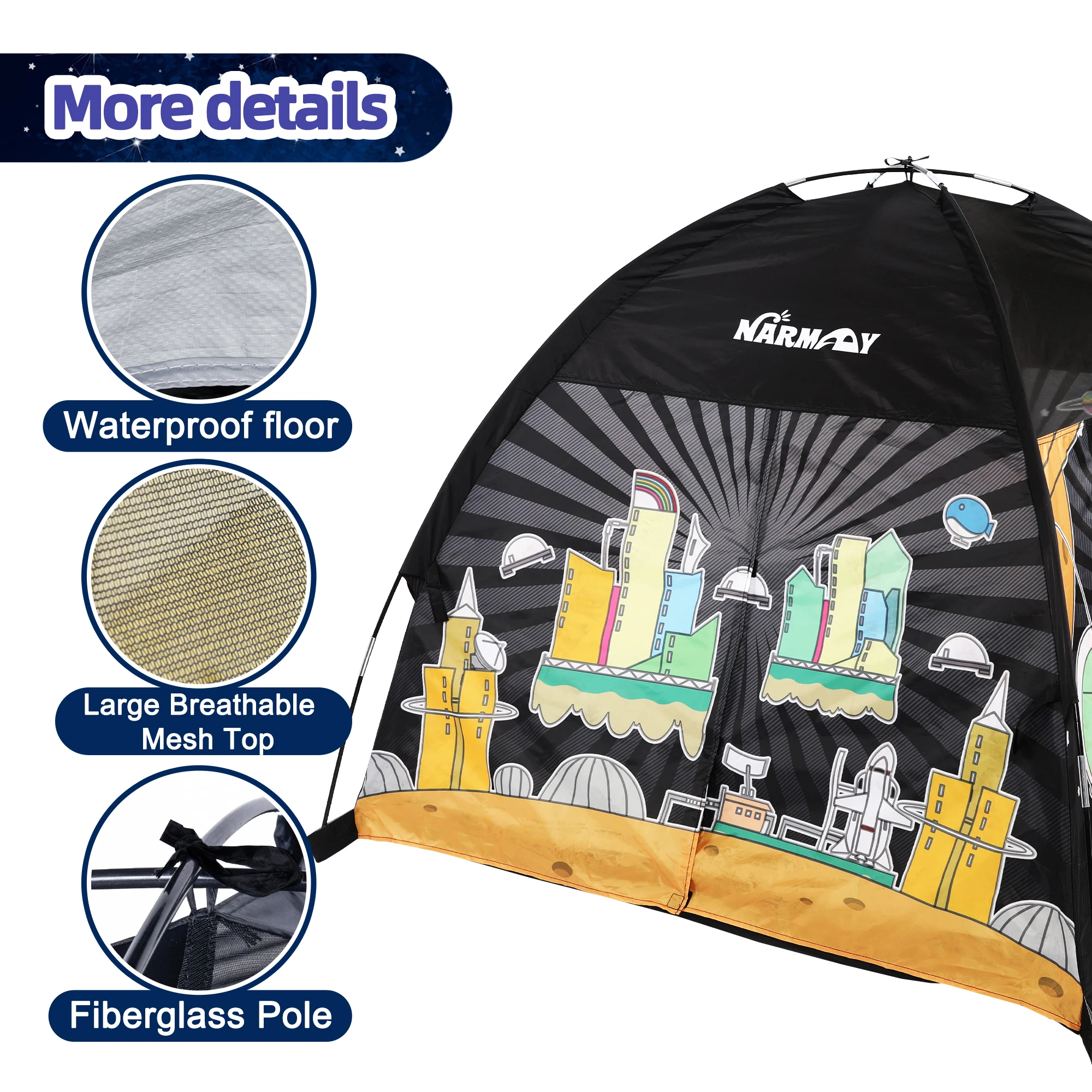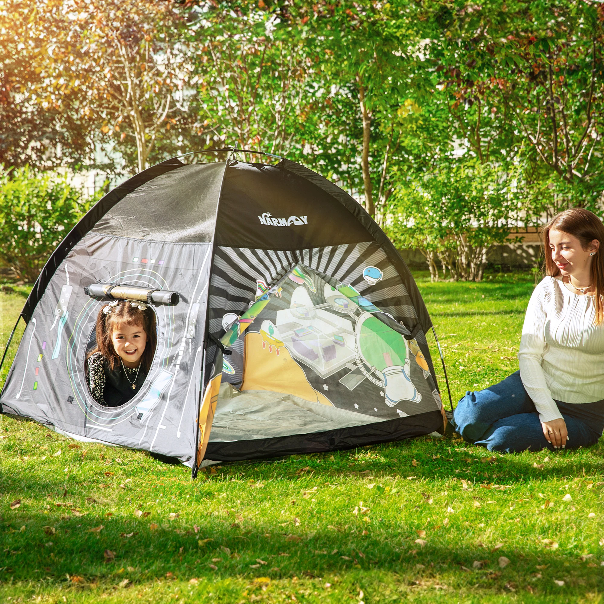 Ett stort, lättuppsättbart lektält i galaxtema för rolig lek inne eller ute.