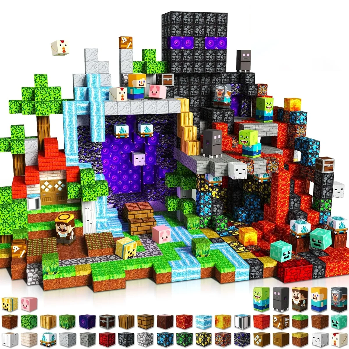 Magnetiska byggblock i plast låter barn och vuxna skapa små landskap med voxelbaserad, kubformad design. Blocken kopplas ihop med magnetiska anslutningar och är enkla att bygga om till olika dioramor och modeller.