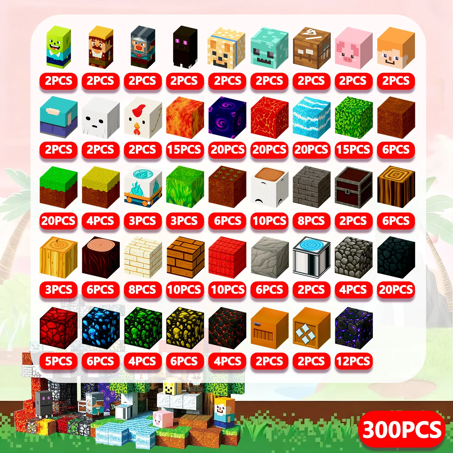Färgvariationer finns tillgängliga och blockens yta är glansig med en pixelbaserad textur som ger ett lekfullt, spelinspirerat utseende. Storleken på varje block är cirka 2 cm.
