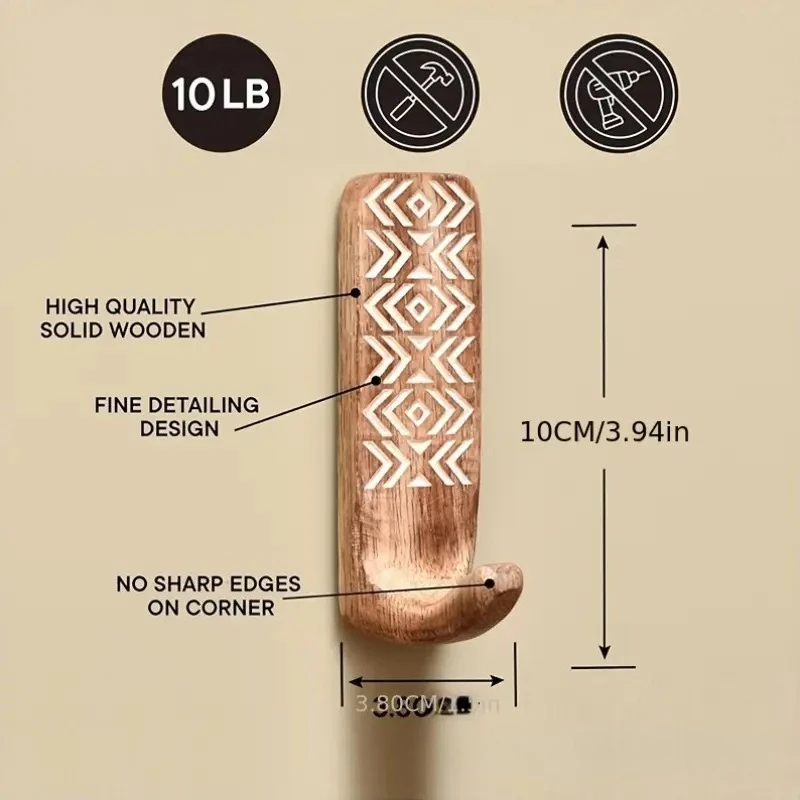 Denna väggmonterade krok i massivt trä har ett matt naturligt träutseende med vita geometriska inlägg och mönster. Krokens böjda form gör den praktisk för nycklar, kläder eller småföremål i hallen, entrén eller sovrummet.