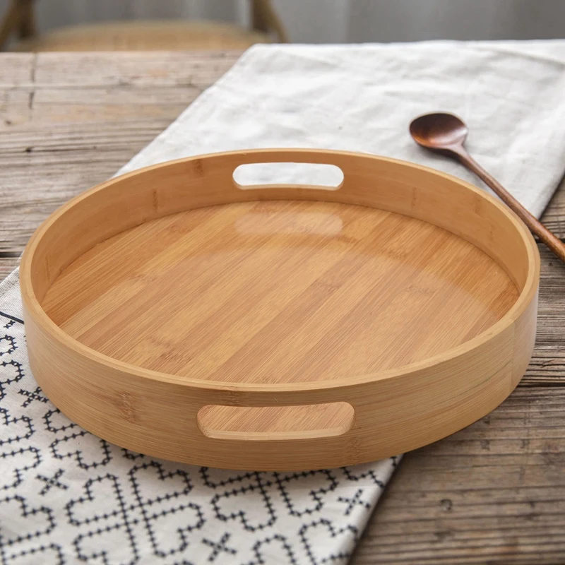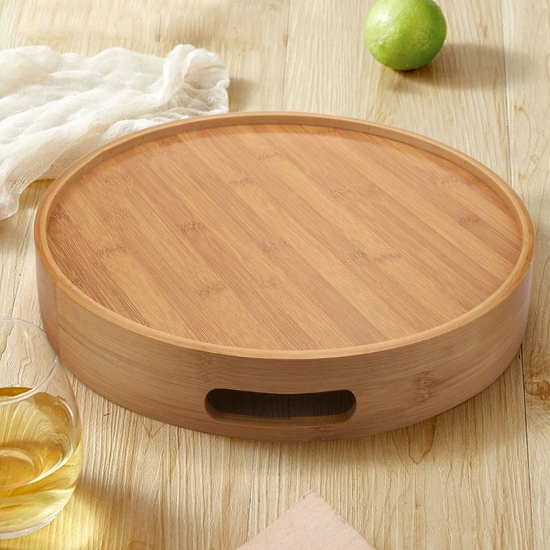 Rund serveringsbräda i naturligt trä med slät yta och låga kanter. Brädan har integrerade ovalformade handtag längs kanten för enkel hantering.