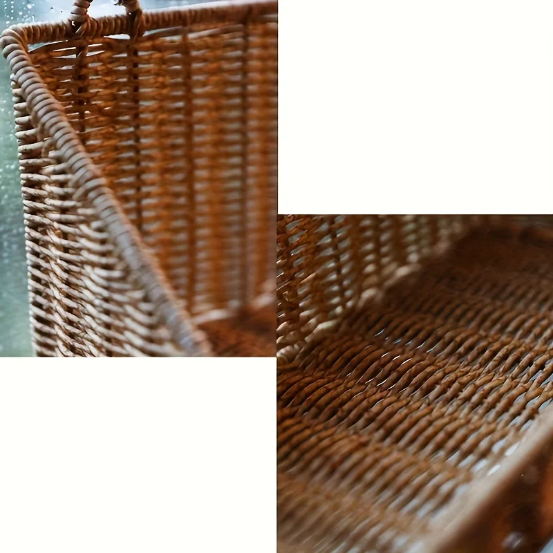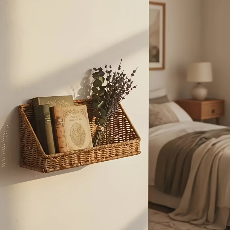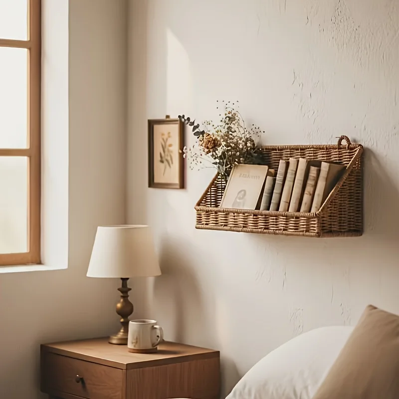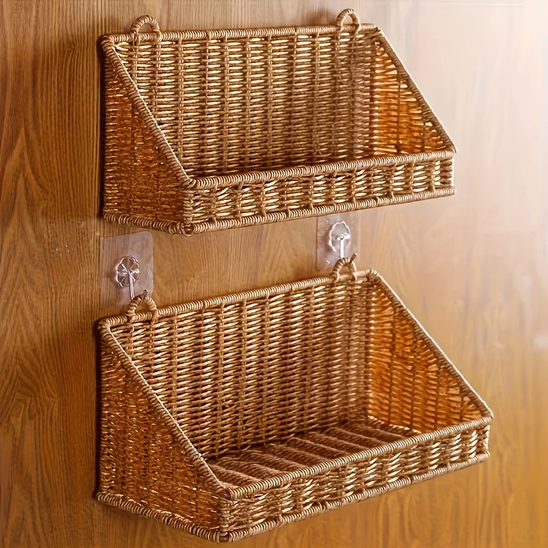 Rustik väggmonterad korg med krokar – flätad rottingförvaringskorg för badrum, kök, sovrum och vardagsrum