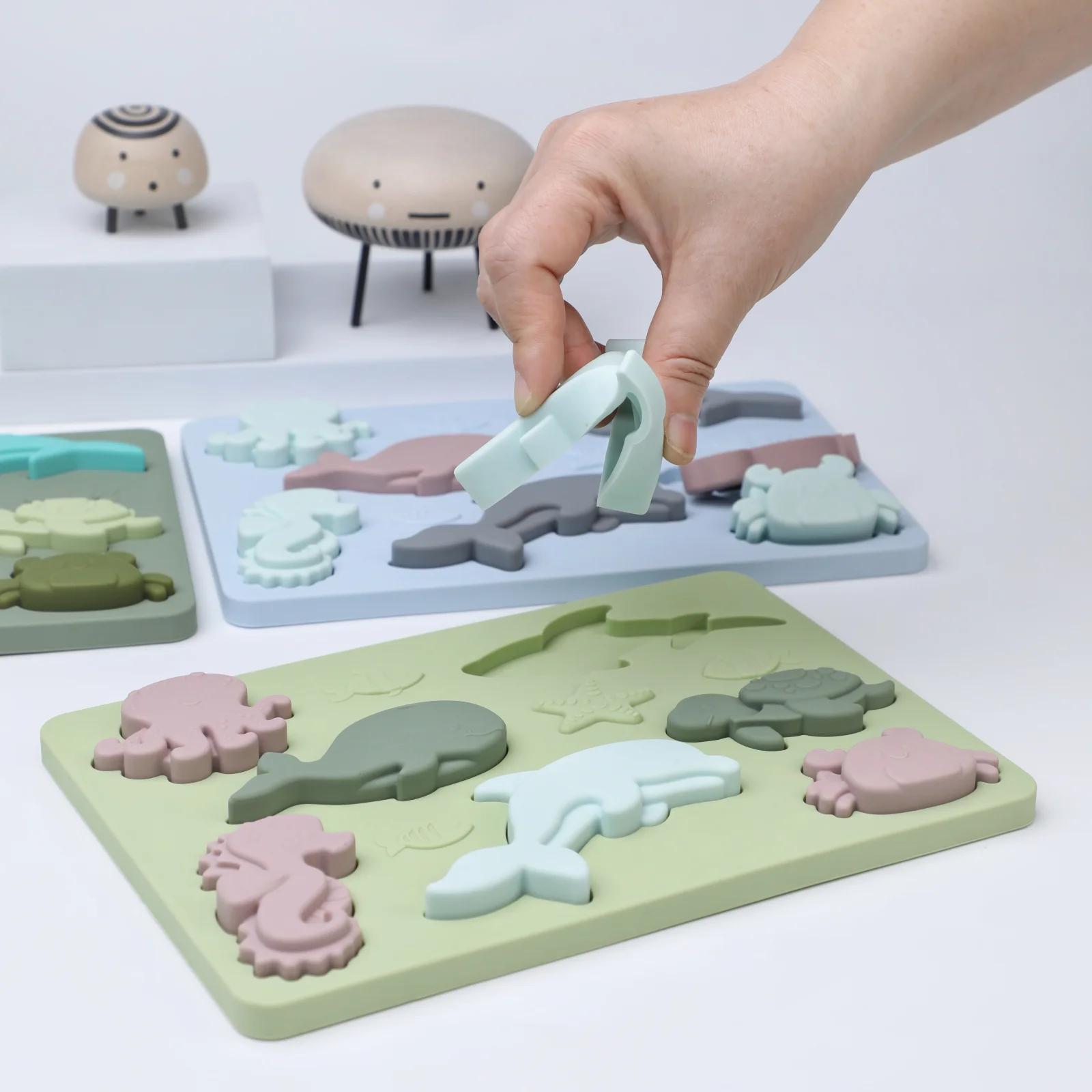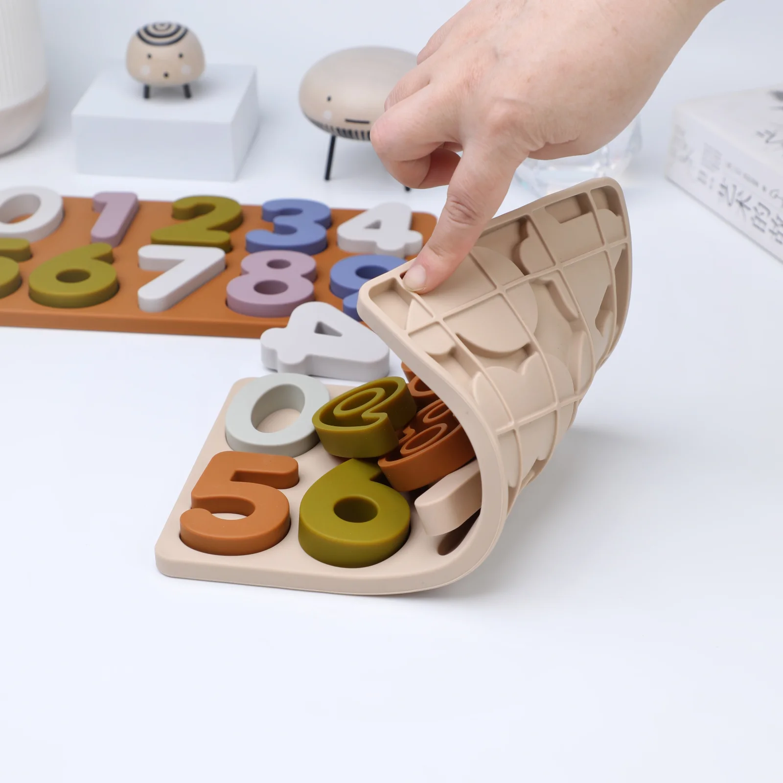 Ett pedagogiskt pussel i silikon som presenterar alfabetet med både stora och små bokstäver i ett tydligt rutnät. Det rektangulära brädet har upphöjda bokstavs- och sifferformer som är enkla att känna igen för små händer och att placera rätt på plats.