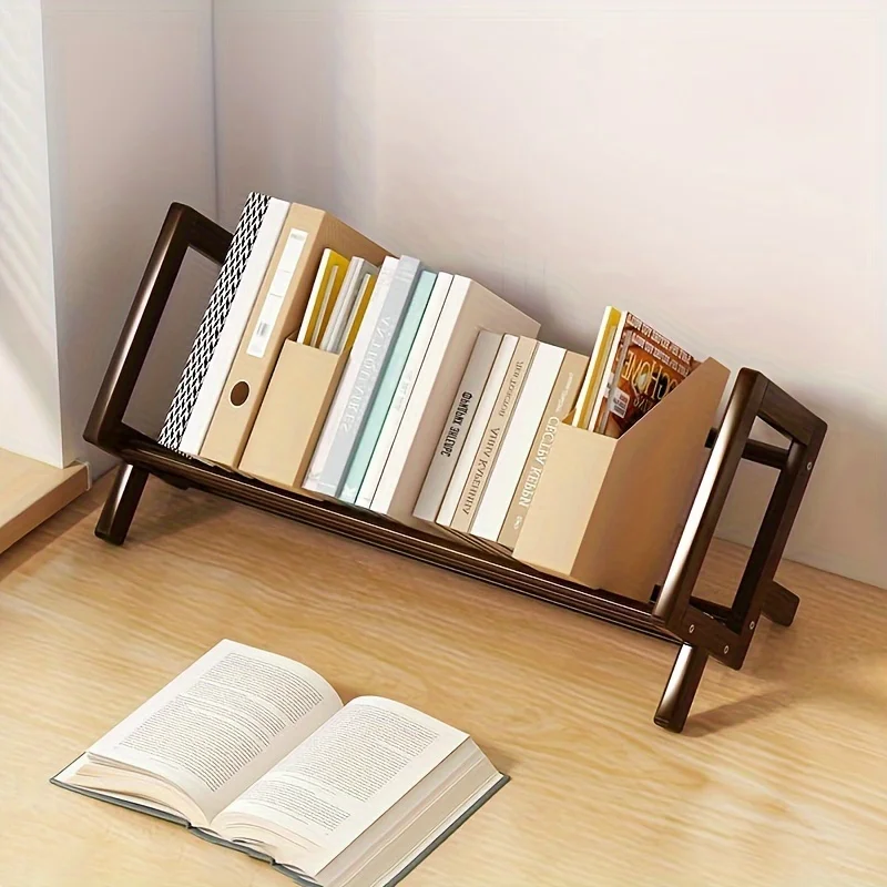 Denna kompakta förvaringshylla är tillverkad i naturlig bambu och har en enkel A-formad lutande design som passar på skrivbordet eller i närheten av arbetsytan. Den erbjuder plats för småprylar som pennor, anteckningsböcker och andra småsaker.