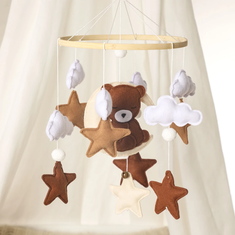 Skapa en lugn och mysig atmosfär i barnets rum med en spjälsängsmobil i mjuk filt. Den runda bambu-hoopen bär söta figurer i mjuk filt med nalle-, stjärn- och måne-motiv, perfekt för att hålla bebisen sällskap när det är dags att vila.
