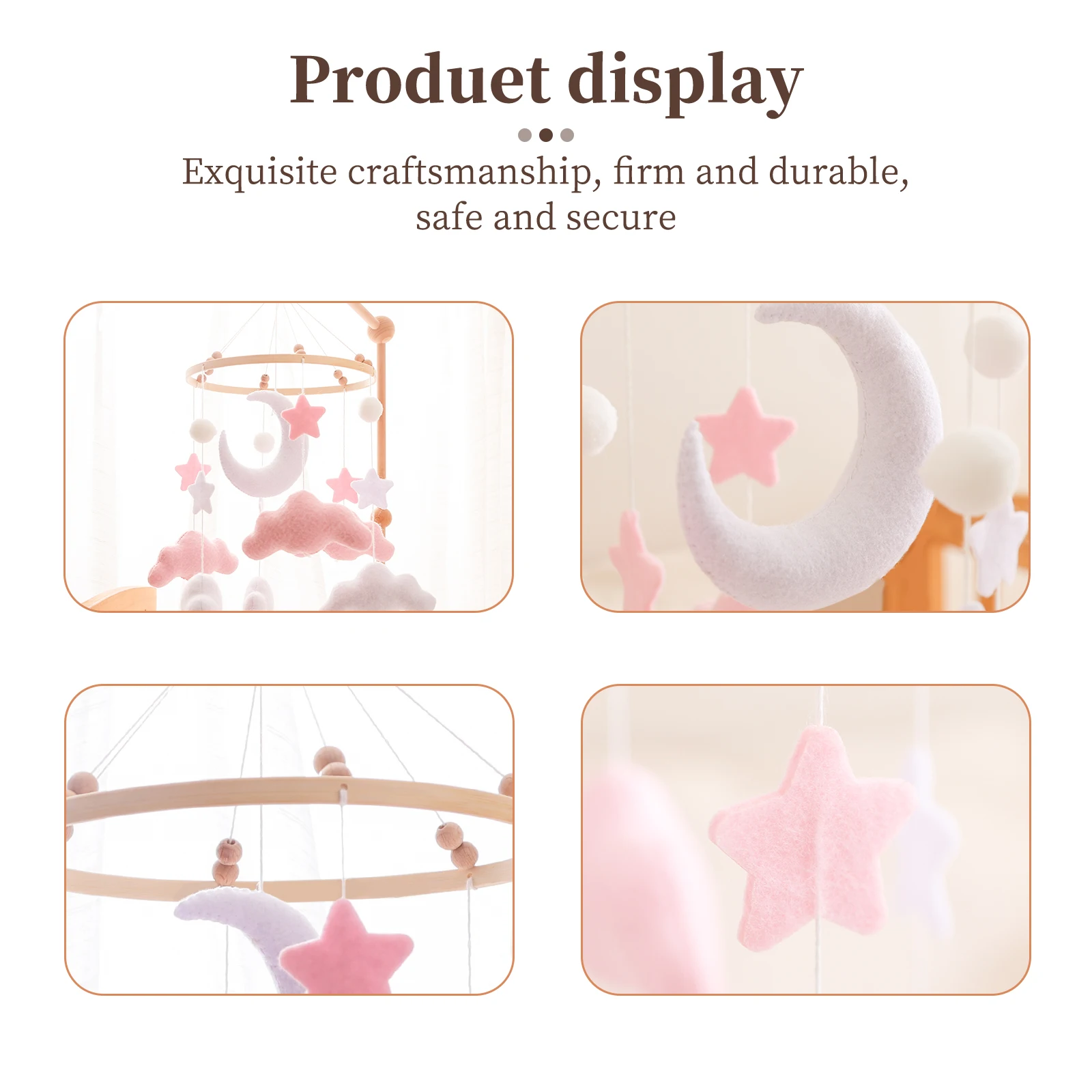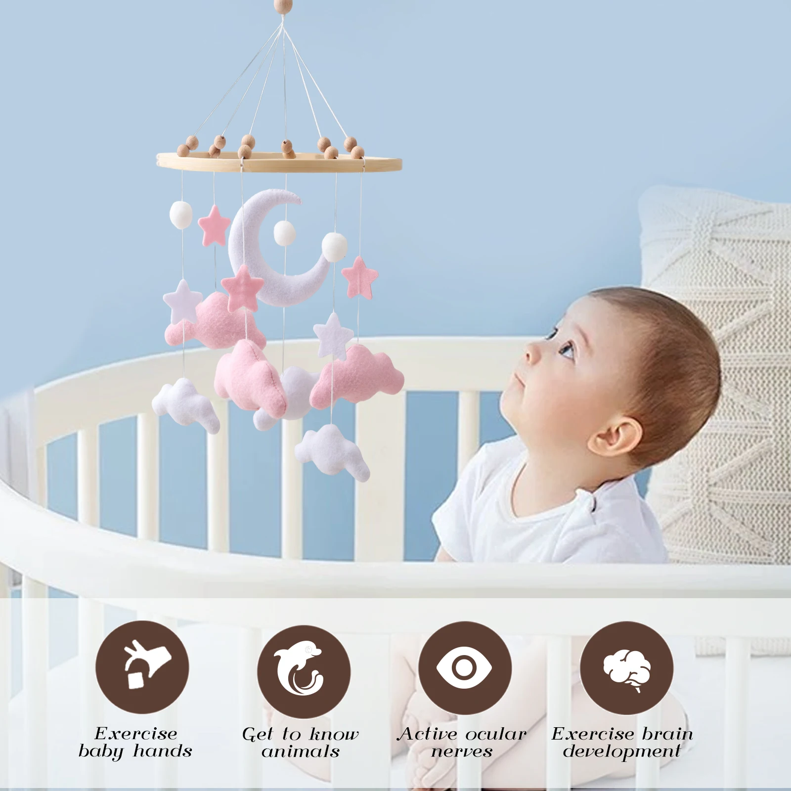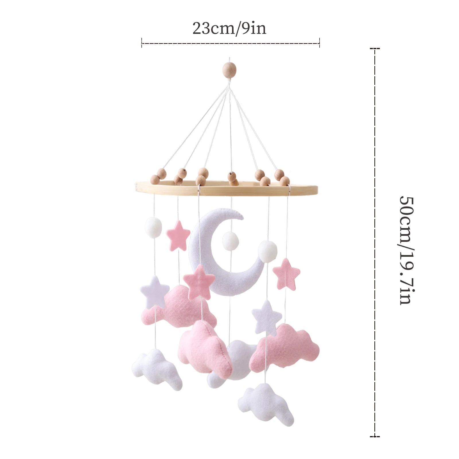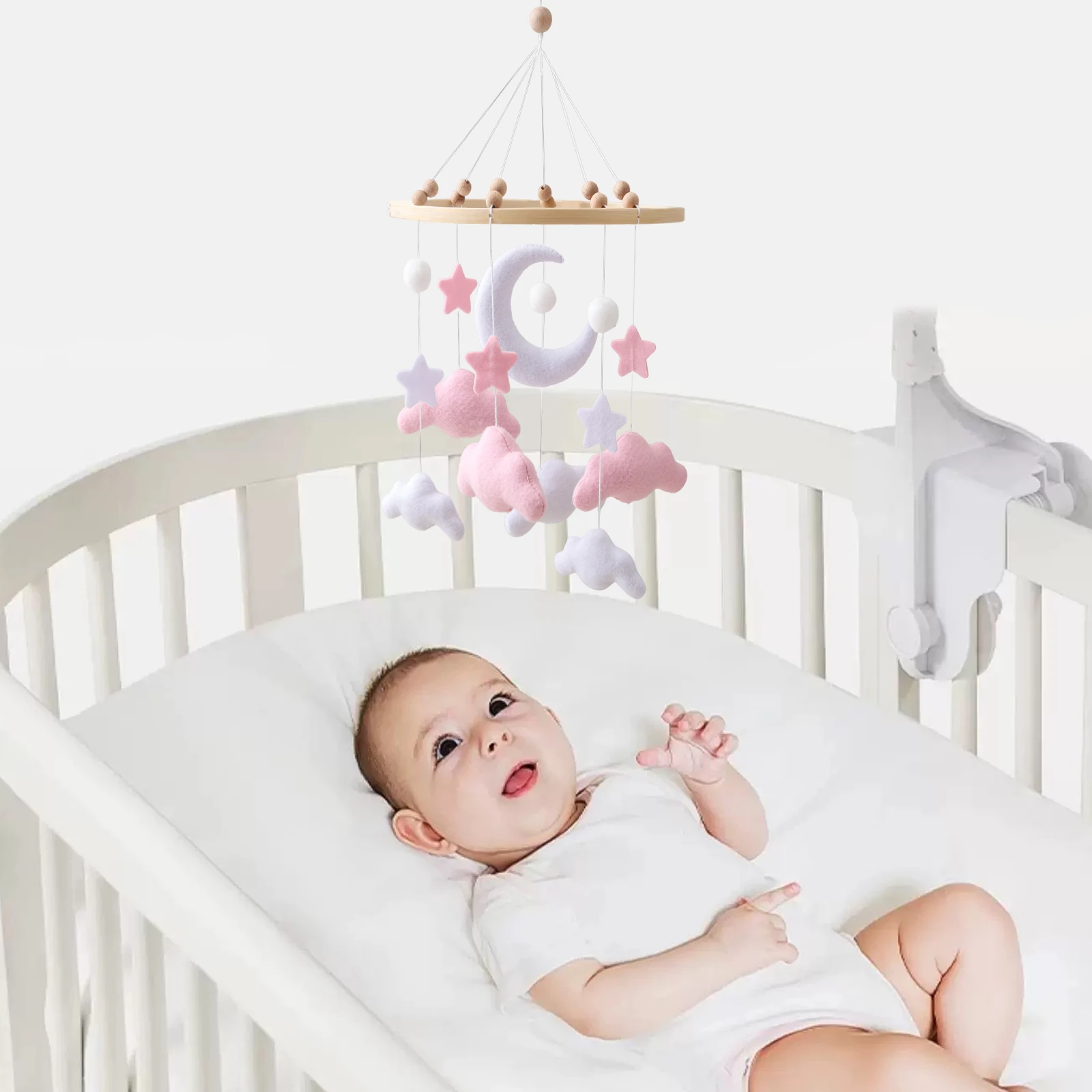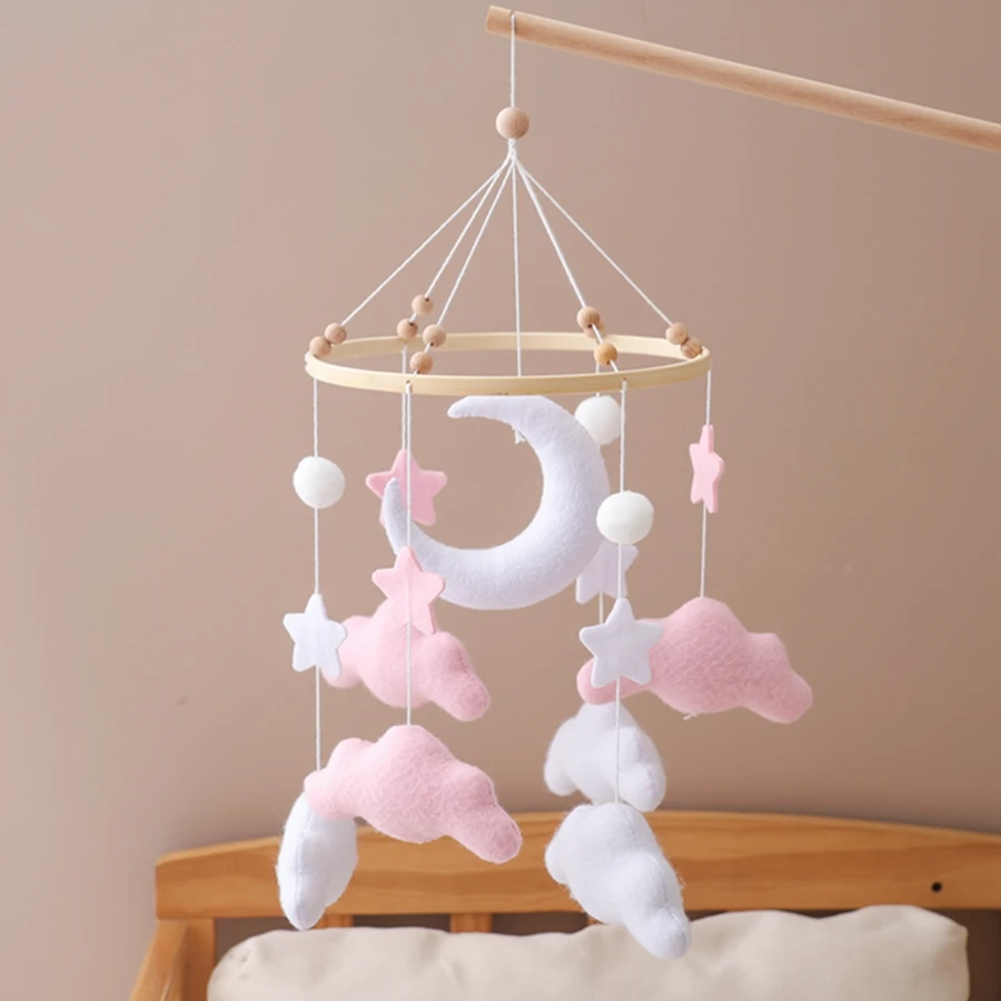 Spjälsängsmobil i mjuk filt – rosa moln, hängande vindklocka för nyfödda