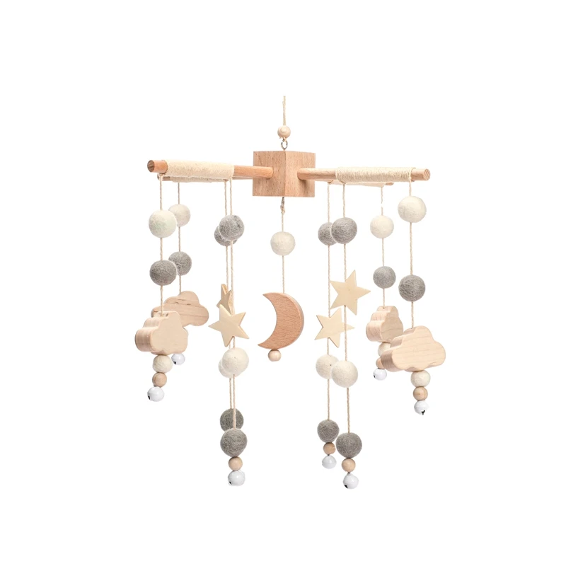 Spjälsängsmobil i trä med mjuk filt och bambu som skapar lugn och mys i bebisens rum. Designen är inspirerad av stjärnor, måne och björn i mjuka färger.