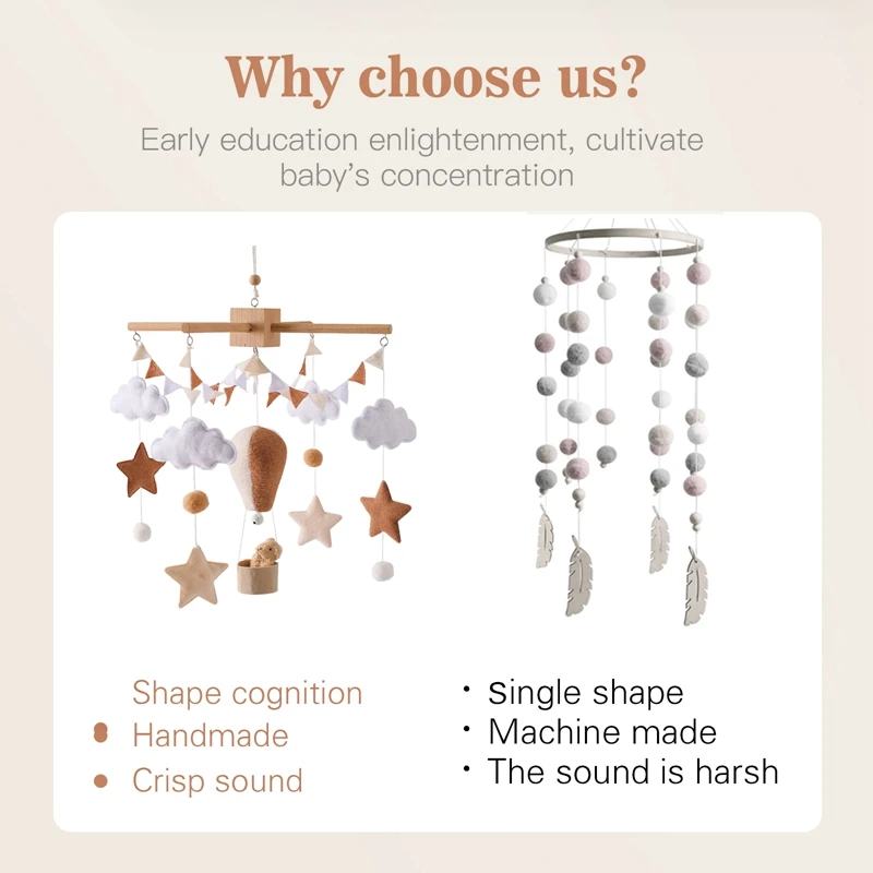 Denna mobil kan kompletteras med en musikbox för extra ro. CE-certifierad konstruktion och handgjort hantverk ger en naturlig och trygg känsla som passar modern nursery-dekor.
