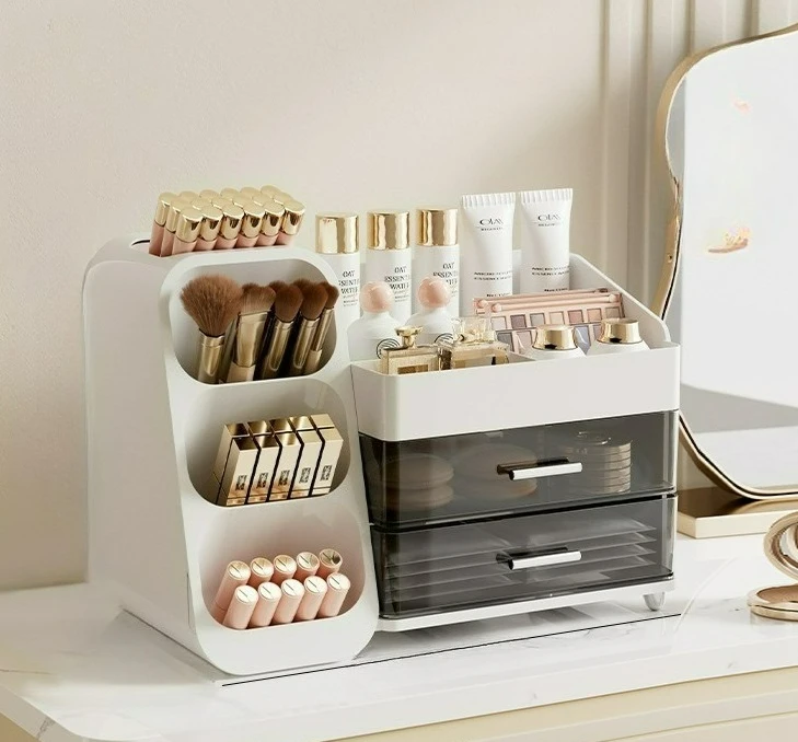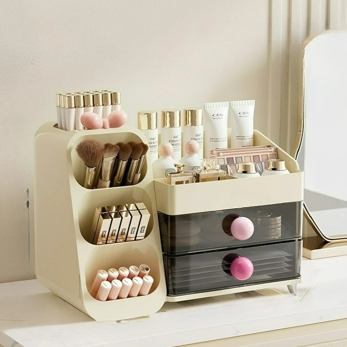 Färgalternativ inkluderar Pink, Ivory och Beige. Produkten är tillverkad i plast/akryl med guldtonade detaljer och genomskinliga lådor för en sofistikerad look. Multifunktionell och återanvändbar för olika skönhetsprodukter.