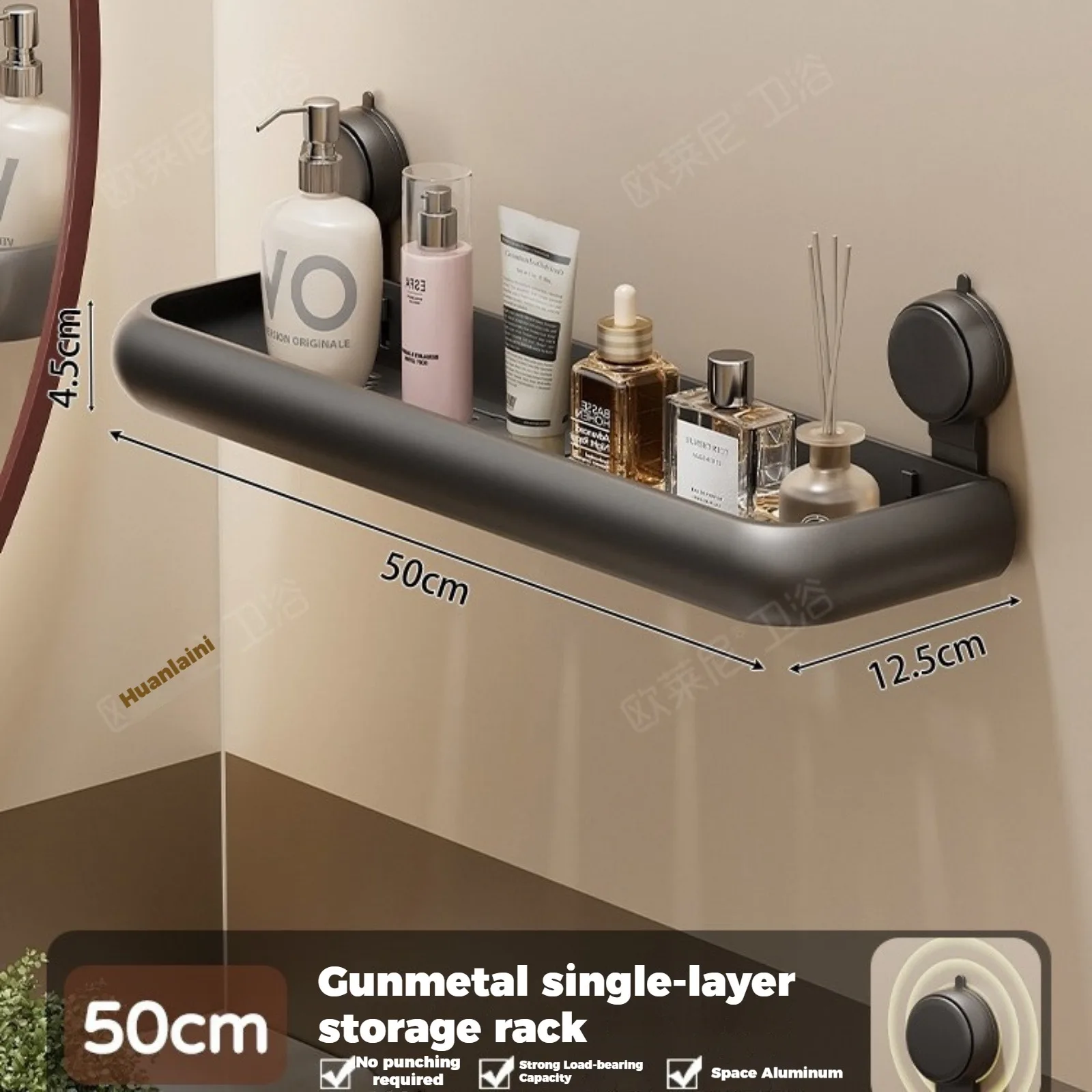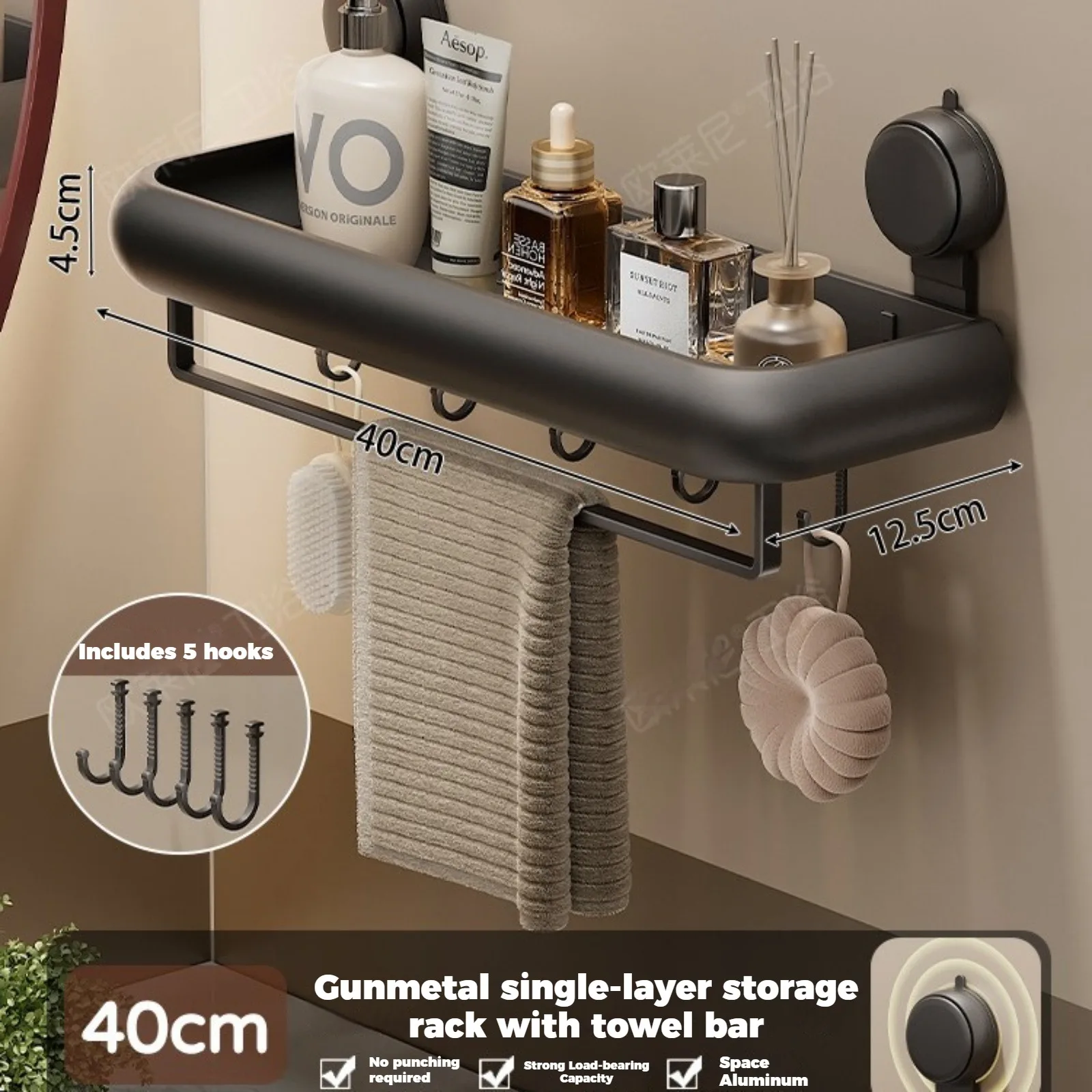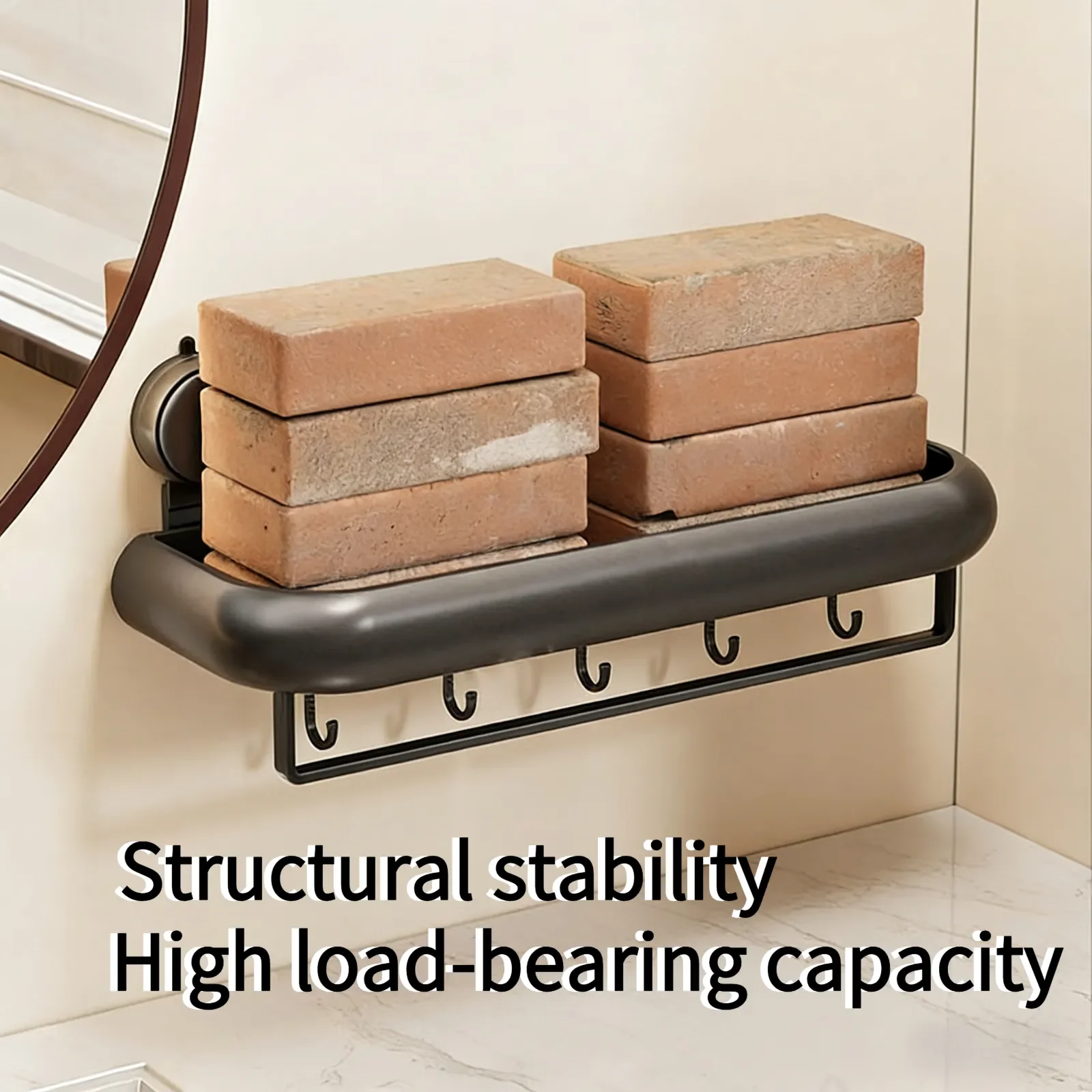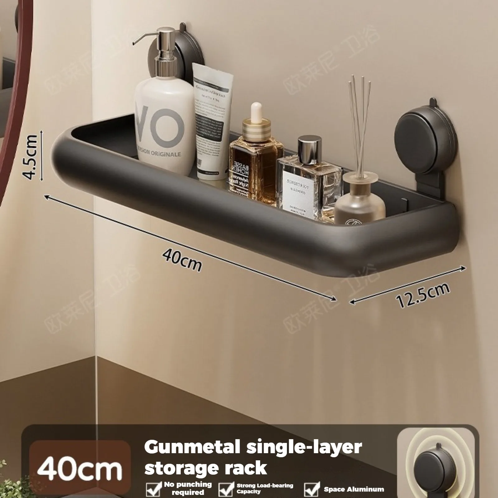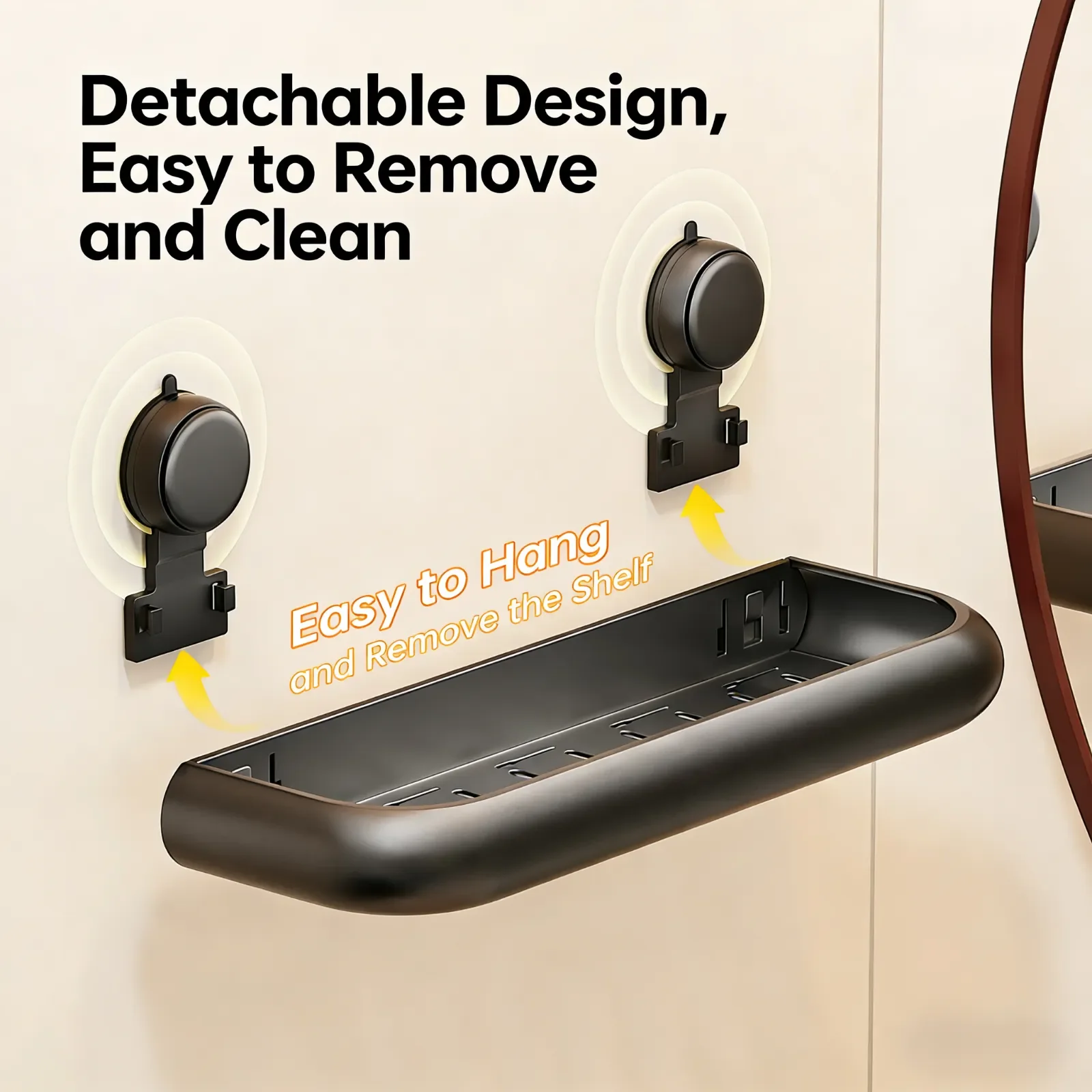 En praktisk väggmonterad hylla som fästs utan borr genom en sugkoppsbas. Perfekt för badrum eller andra rum där extra förvaring behövs utan att göra hål i väggarna.