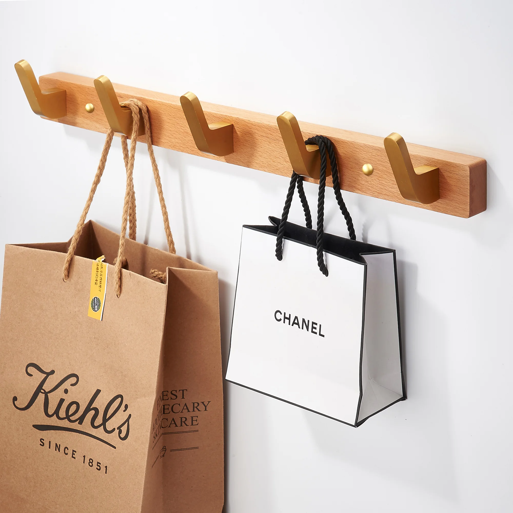 Elegant svart väggkrok i trä med fem krokar för väggmonterad upphängning.
