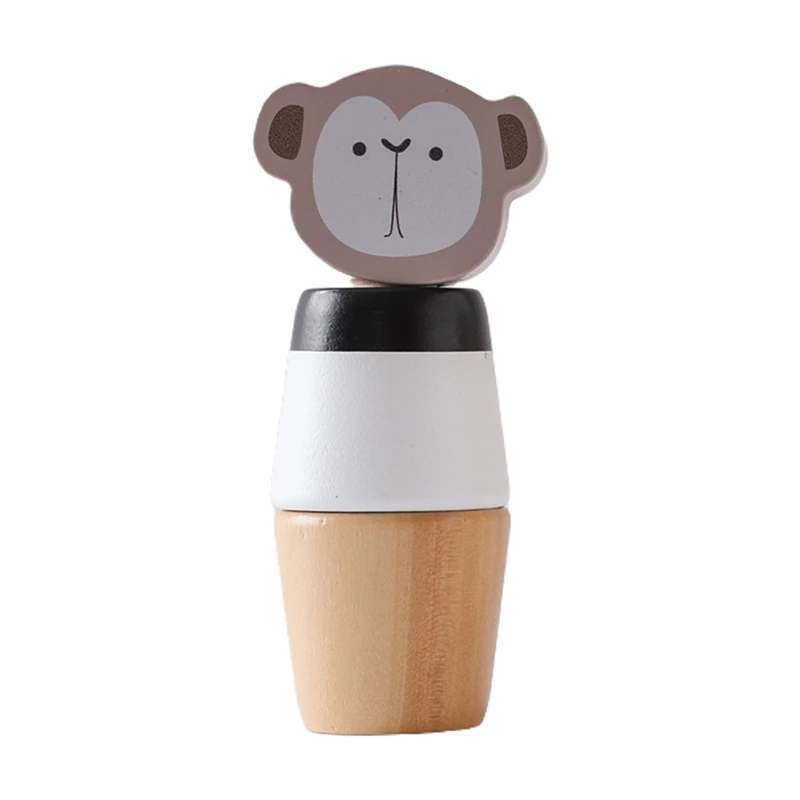 Lekens konstruktion består av staplingsdelar med mjuka, djurhuvuden på cylindriska kroppar. Leksaken producerar ett mjukt ljud när den aktiveras och har rundade kanter samt en naturlig träfinish för säker lek.