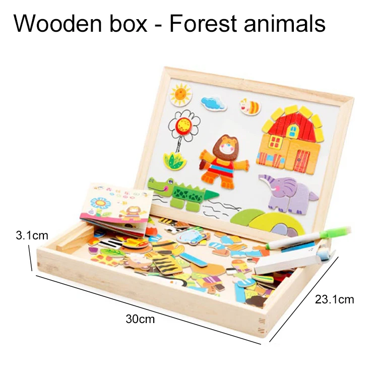 Tillverkad i trä med naturlig finish och färgglada motiv. Brädan visar olika djur- och naturmotiv och innehåller både pusselbitar och magnetisk skrivyta för fri ritning.