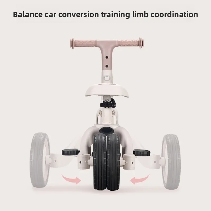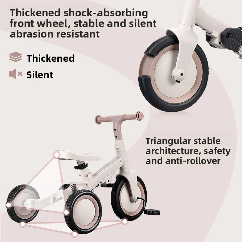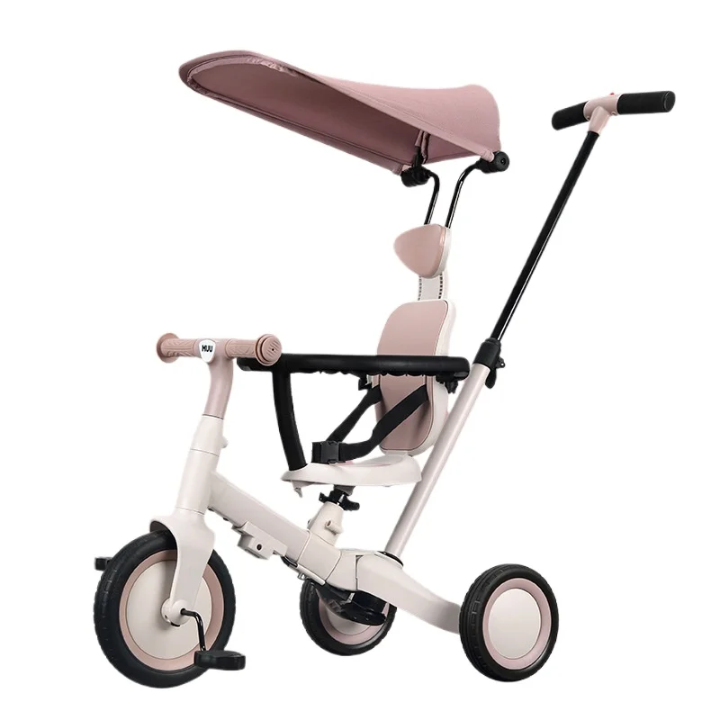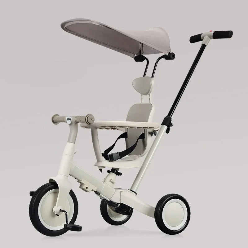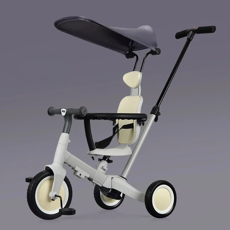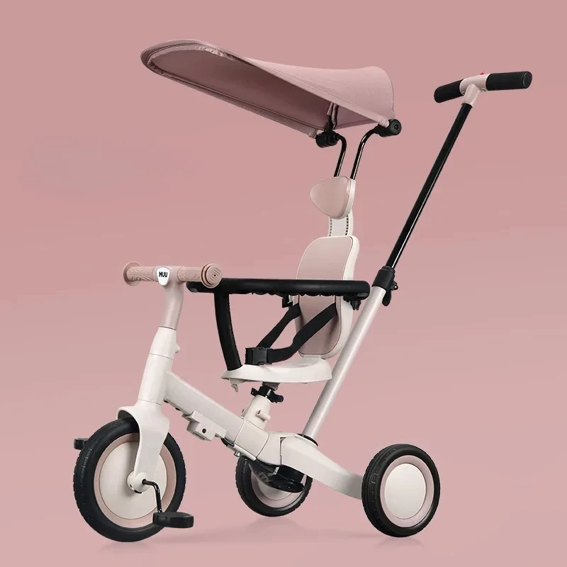Denna mångfunktionella trehjuliga barnkärra är utformad för utomhuslek och ger flera körlägen i ett praktiskt fordon. Den har en hopfällbar konstruktion och en solskärm som ger skydd mot solen.